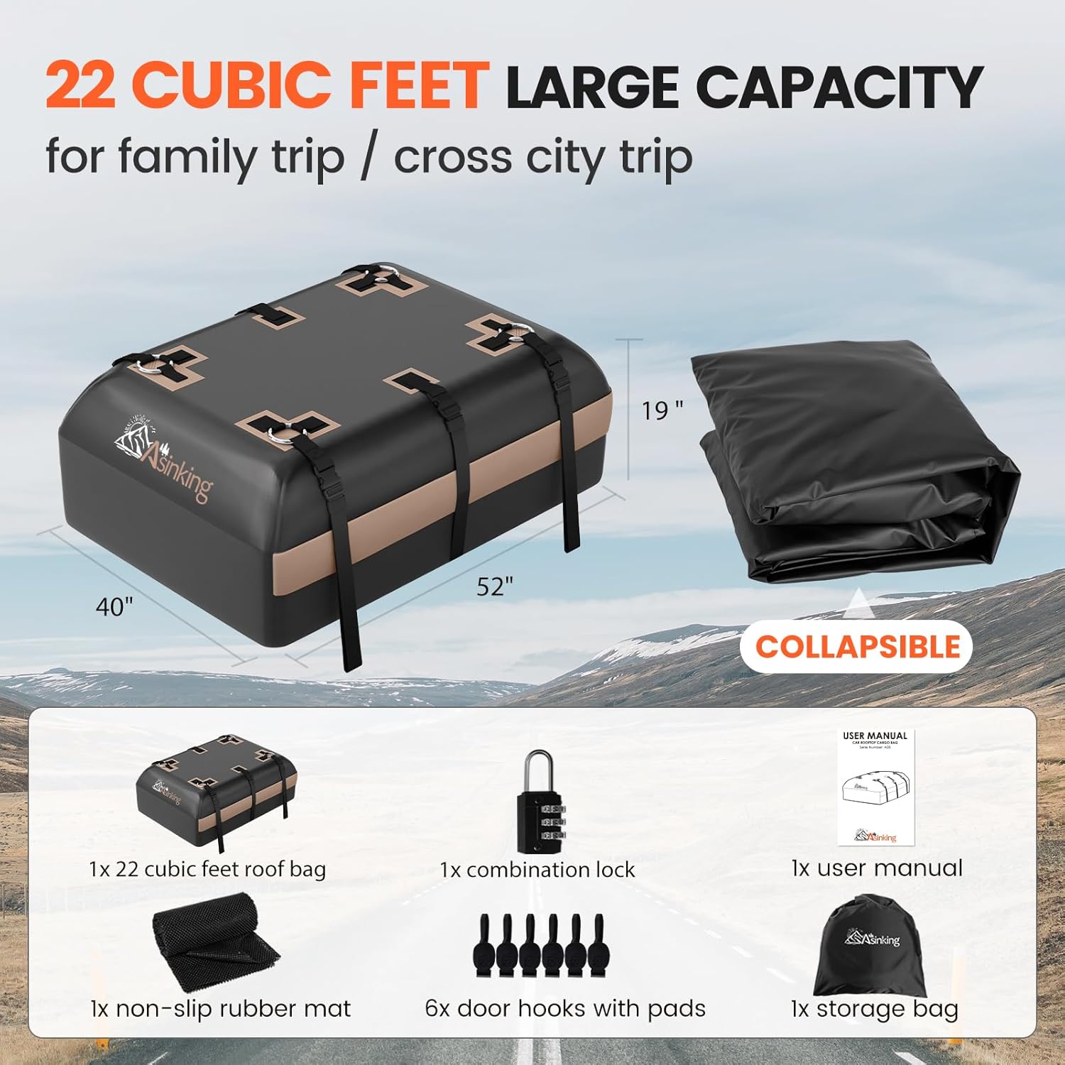 - γππΌπππ πΎπΌππΌπΎπππ πππ πΎππππ πΎπππ ππππγWith 22 cubic feet jumbo volume, this Asinking car topper luggage carrier waterproof could hold meanwhile 4x sleep bags, 4x suitcases, 2x double tents, and still lots of room for some road trip essentials. Pefect for family road trip or cross city adventures. If you are car dwellers, this rooftop cargo bag would be a life saver.