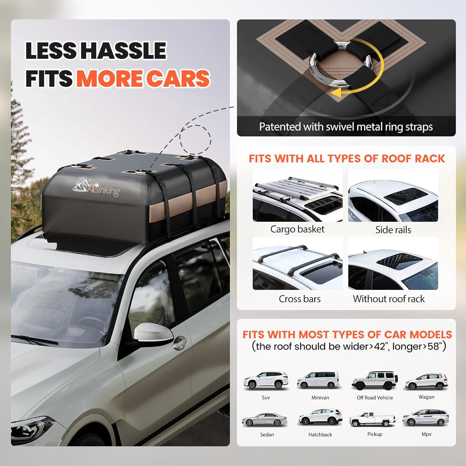 - γπππππΌπΏππΏ π½πΌπππΏ ππ ππππ πΎπππΎππππγOur Asinking roof rack cargo carrier is totally upgraded with thicker material, stronger seams for high break strength up to 500 pounds, larger and smoother zipper, heavy duty straps and easier installation, to maximum reduce any quality issues during your road trip. 100% waterproof, snowproof, and ultra-secure to use, durable that resists to any harsh elements.