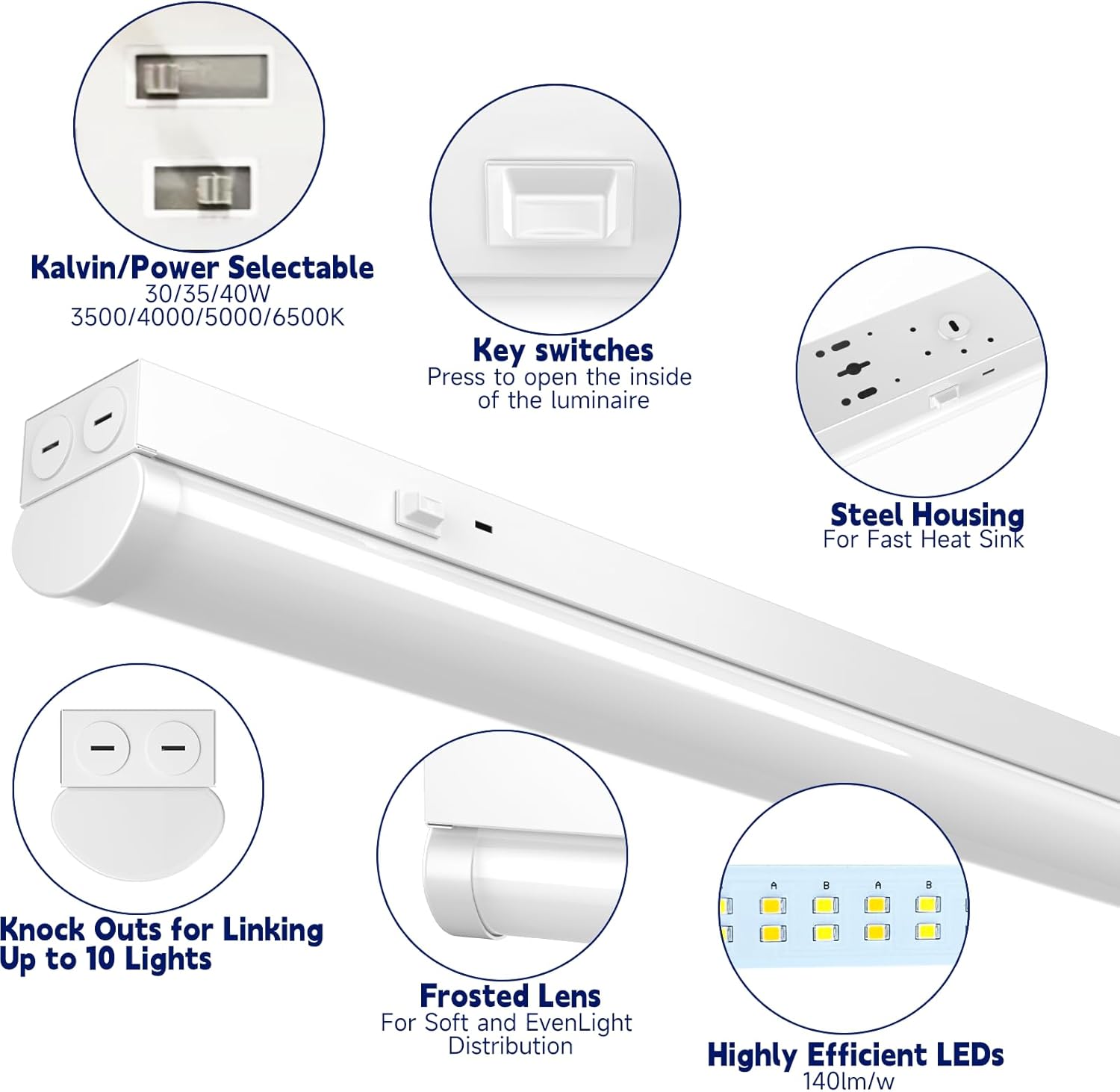 4FT LED Linear Strip Light, LED Shop Lights 40W/35W/30W Selectable,4 Color Selectable 3500K-6500K Adjustable,0-10V Dimmable Commercial Garage Office Ceiling Light Fixture, ETL DLC Listed (9 Pack)