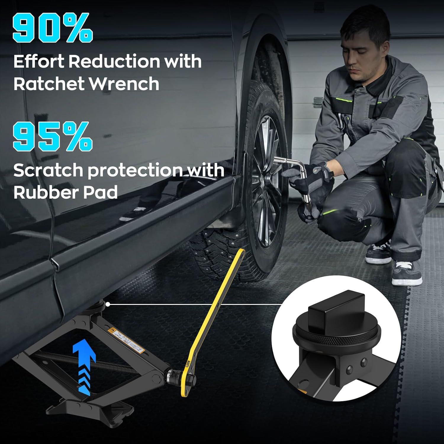 - 【Durable and Reliable】This car jack kit is made of high-strength cold-rolled steel with an enlarged base that ensures its stability during lifting; the jack comes with two non-slip Jack rubber pads that match it, which protects the car from steel beam scratches while lifting.