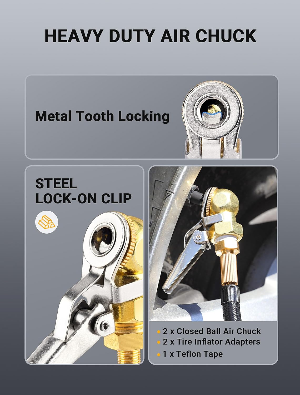 - 【Hands Free & Easy Operation】: This air compressor chuck comes with a steel lock-on clip, which offers a more ergonomic angle for easily holding the chuck in place on the valve stem during air filling operations and making inflation effortless.