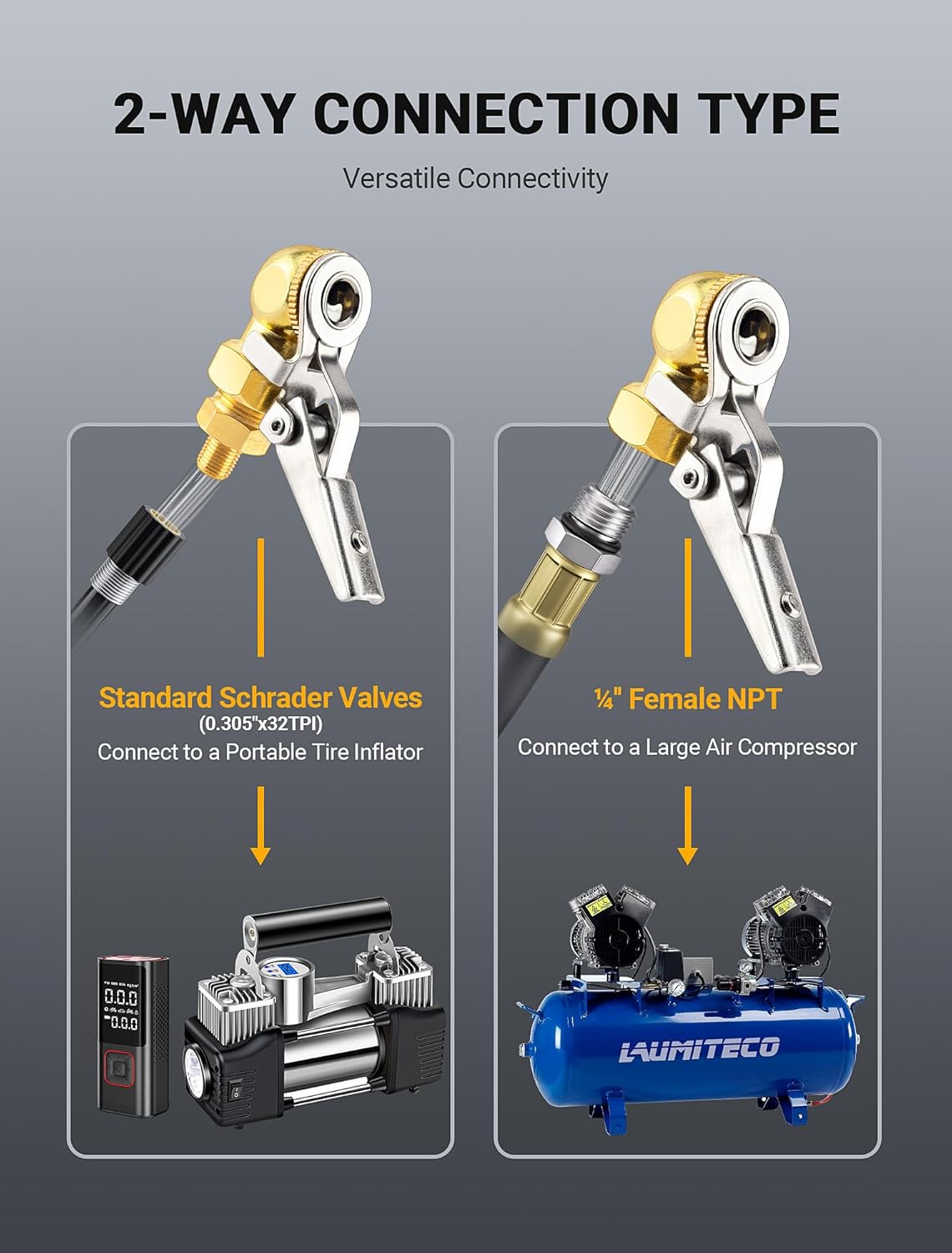 - 【2-Way Quick Connection】: Equipped with 1/4"NPT female threads for easy connection to air pipelines. The standard adapter provides a secure connection to screw on tire inflator hoses. Suitable as a professional choice for portable air compressors/tire pressure gauges/air pumps, air hoses, tire chucks, and other air accessory connections.