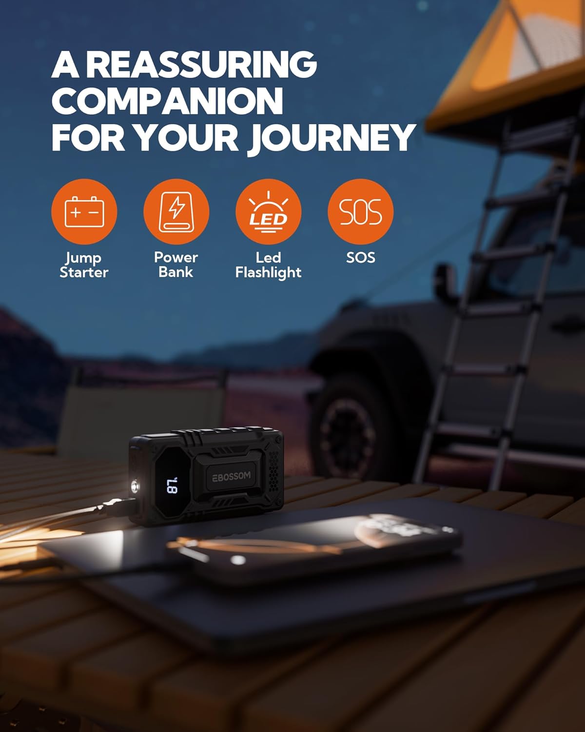 - WHAT YOU GET :EBOSSOM jump pack (1* Portable Car Battery Booster, 1* Smart jumper cables, 1* USB-C charging cable, 1* user manual, 1* portable Flannel storage bag, Lifetime tech support. If you have any after-sales questions about jump starters and tire, please contact us.