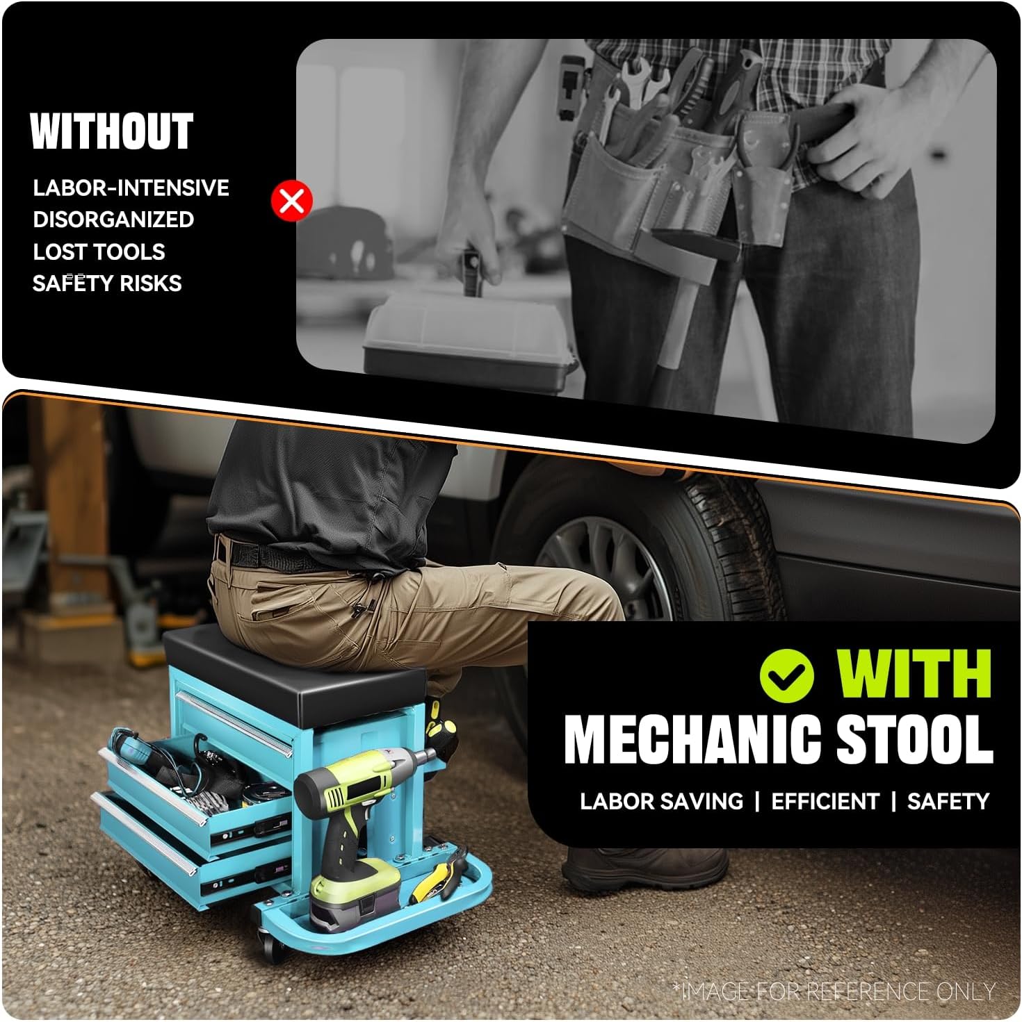 - 360-Degree Swivel Casters: Our tool chest seat features 4 x 2.5-inch swivel casters, allowing for smooth maneuvering in your garage, reducing the time spent moving around, letting you focus on the job at hand