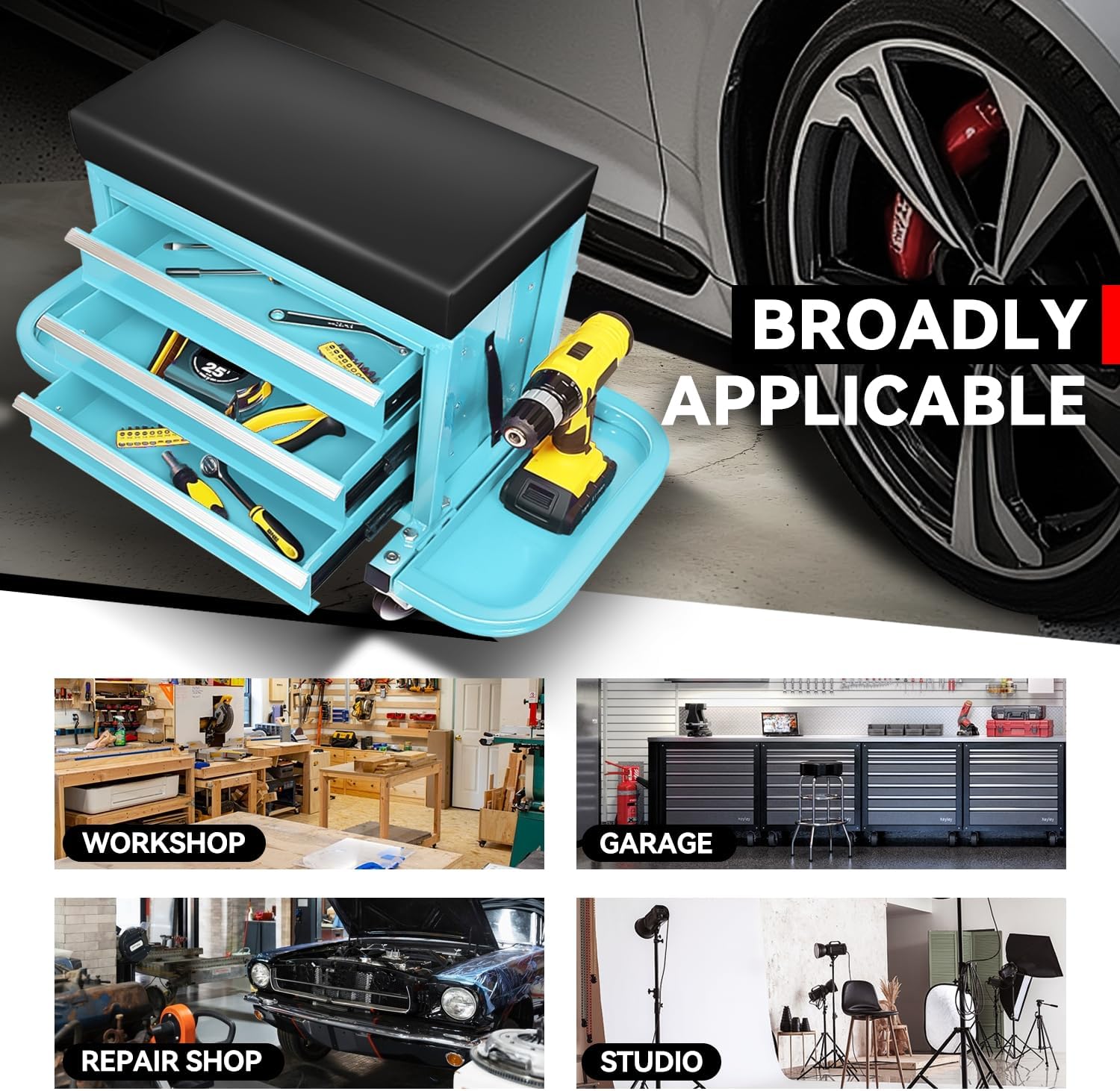 - Convenient Storage: This rolling seat has 3 drawers and 2 fold-down side trays, which offer ample storage for small tools and parts. Keep your car care and repair essentials close at hand, allowing you to work more efficiently.