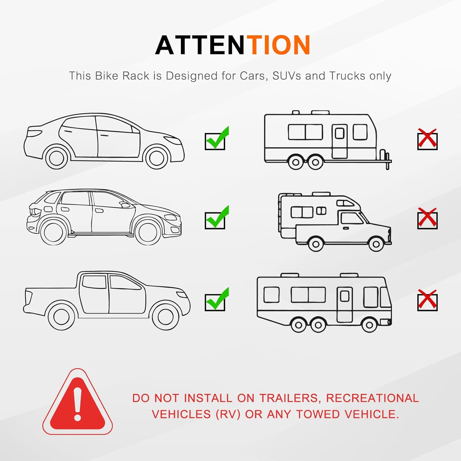 - 2-Bike Capacity & Specifications: This foldable electric bike rack can hold 2 e-bikes (90 lbs each, 180 lbs total). Up to 29" tire diameter, 4" fat tires, and 50" wheelbase. Designed for 2" hitch receivers on SUVs/trucks