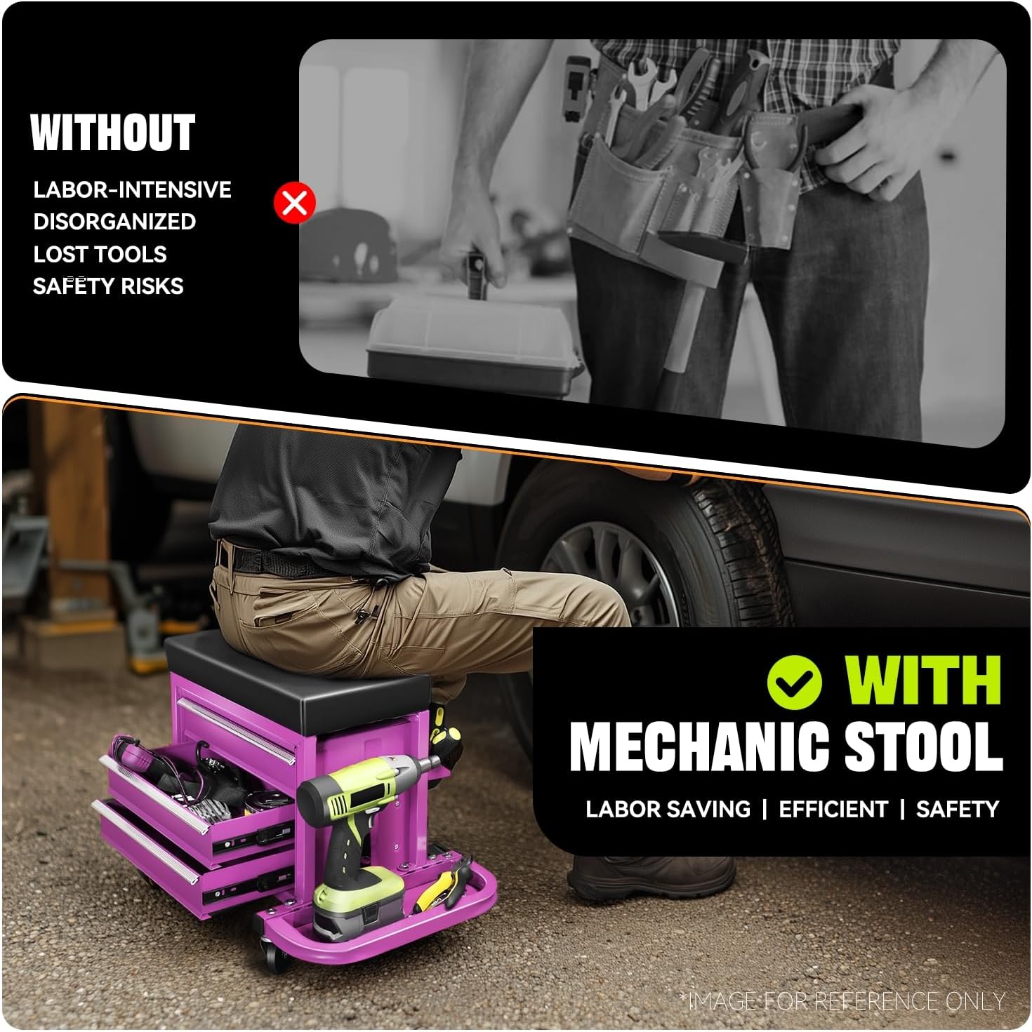 Auto Dynasty 3-Drawer Mechanic Rolling Seat, 350 LBS Capacity Roller Garage Shop Seat with Storage Tool Tray for Workshop, Repair Shop, Warehouse, Purple