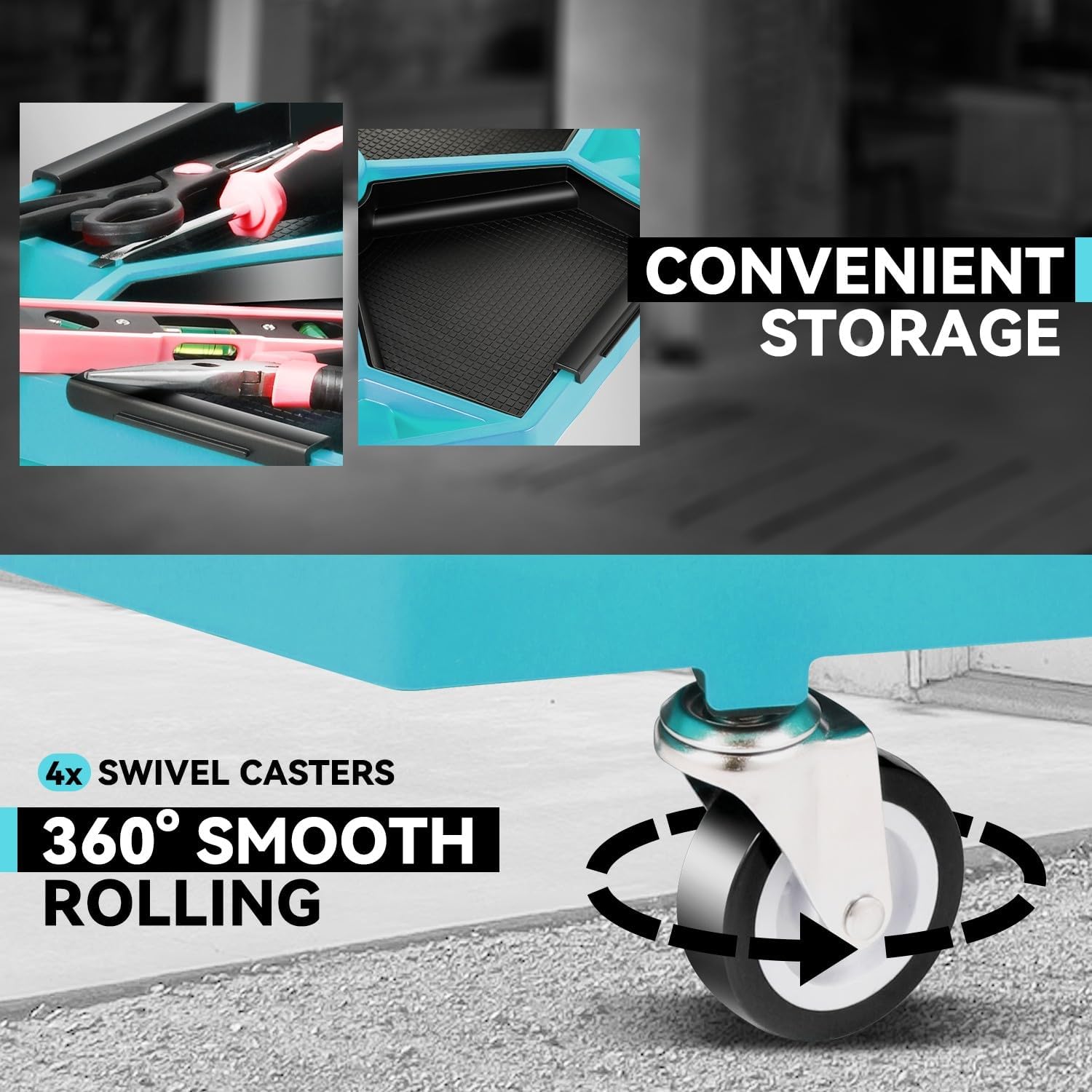 - 【Enhanced Mobility】Equipped with 4 swivel casters, this mechanic stool provides smooth and precise maneuverability around your garage, streamlining your work process.