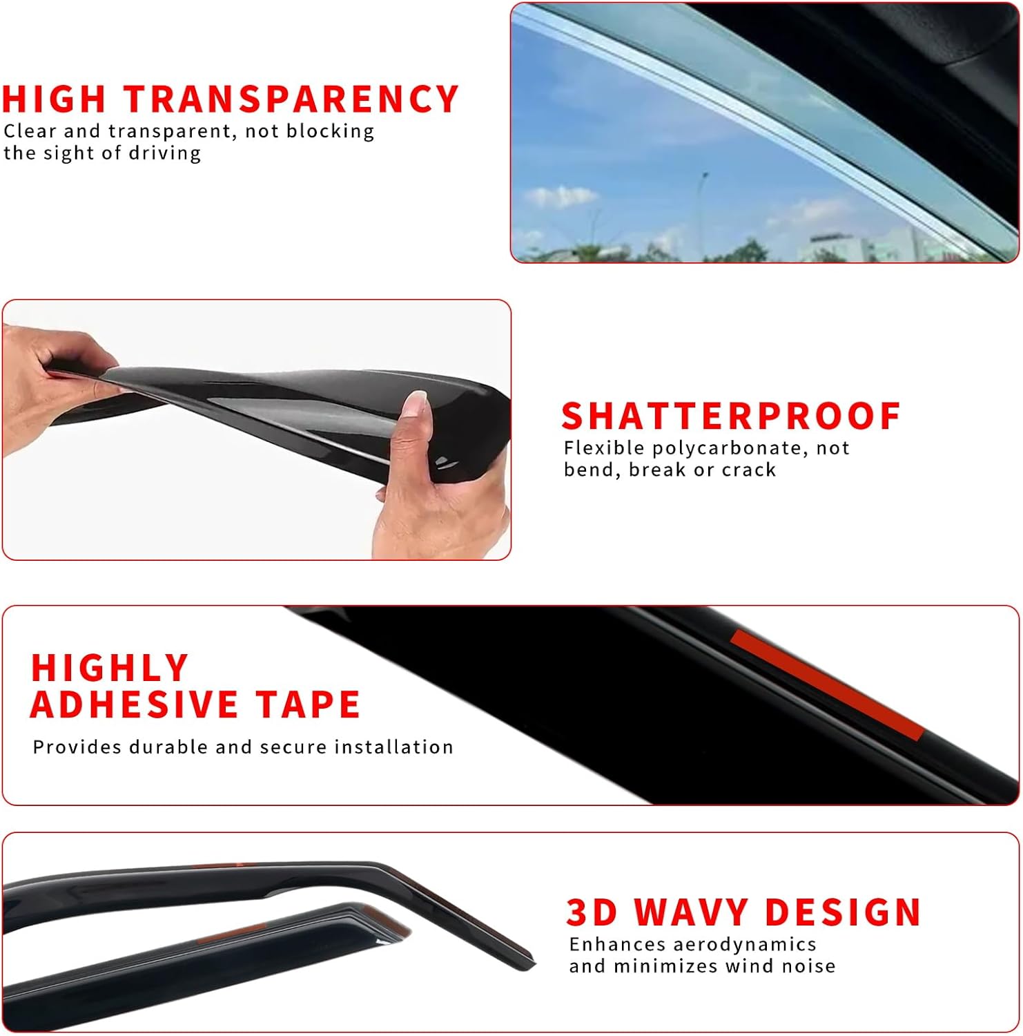 - 【Note】 Please watch the install video carefully before installing the window deflectors. Please avoid washing your car within 48 hours after installation. If there is any question about the vent shades, please feel free to contact us. We will reply to you in 24hrs