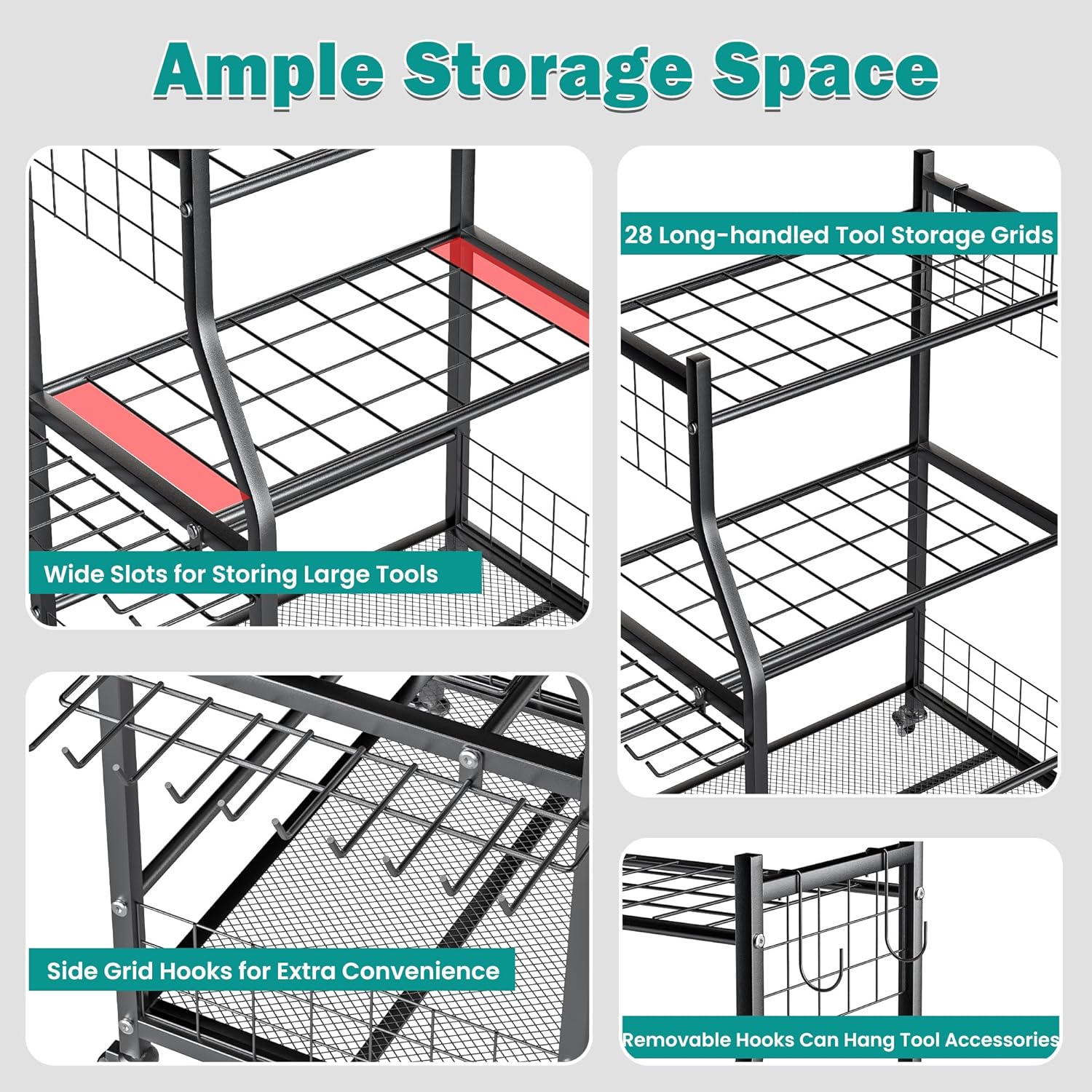 EVERHANGER Garden Tool Organizer Stand, Garage Tool Storage Organization, Yard Tool Racks with lockable wheels, Fit for Long-Handled Tools/Rakes/Brooms, Indoor/Outdoor Use