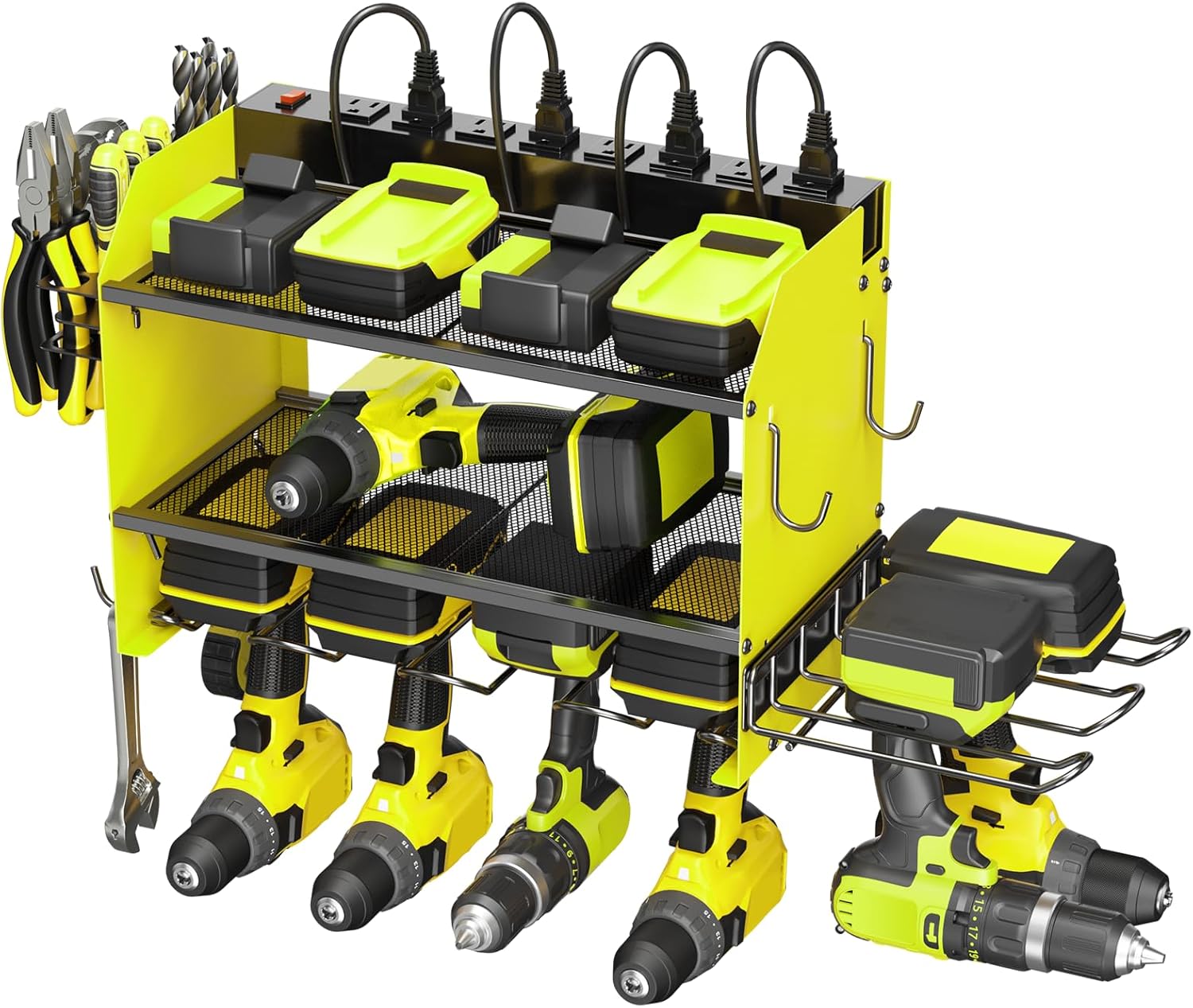 - Wall mount power tools organizer come with 6 slots drills holder, 4 hooks, 2 shelves and drill bit rack, built-in power strip, 3 layer structure can keep different rechargeable tools organized in the work area and save your bench space.