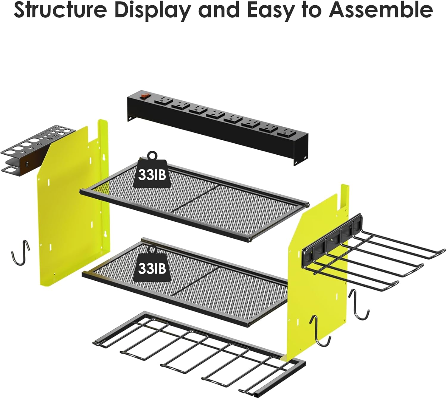 - Easy to assemble and mount on a peg board, If you need more storage space, you can connect the two shelves (or more) by screws. Each layer of the grid can support a maximum weight of 33IB. Made from heavy gauge steel.