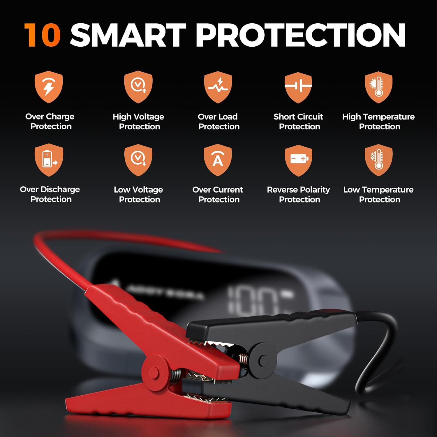 - 【10 Smart Safety Protections】AOOYSORA Jump Starter Power Bank built in 10 different types of protections, which can effectively prevent overcharging, short circuit, reverse connection and sparks, making it very safe to use.The smart jumper cable is designed with durable all-metal clips to prevent possible damage from long-term use.