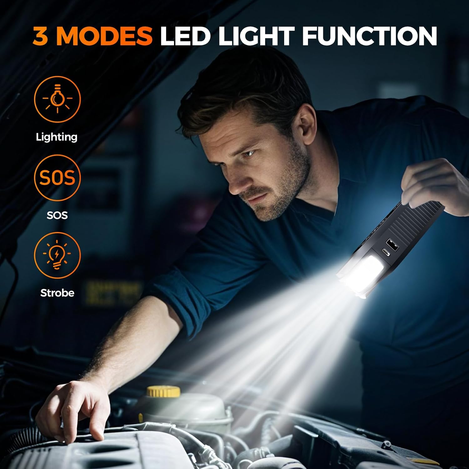 - 【More Than Just a Car Jump Starter】The N1 Jump Starter Battery Pack can also be used as a 16000mAh power bank, equipped with 1 USB output port and 1 Type-C input/output port, which can charge your smartphone or other electronic devices at the same time. The built-in 400LM LED light has 3 modes: flashlight, strobe light and SOS, which is very useful in the dark or emergency, and is a perfect car emergency kit.