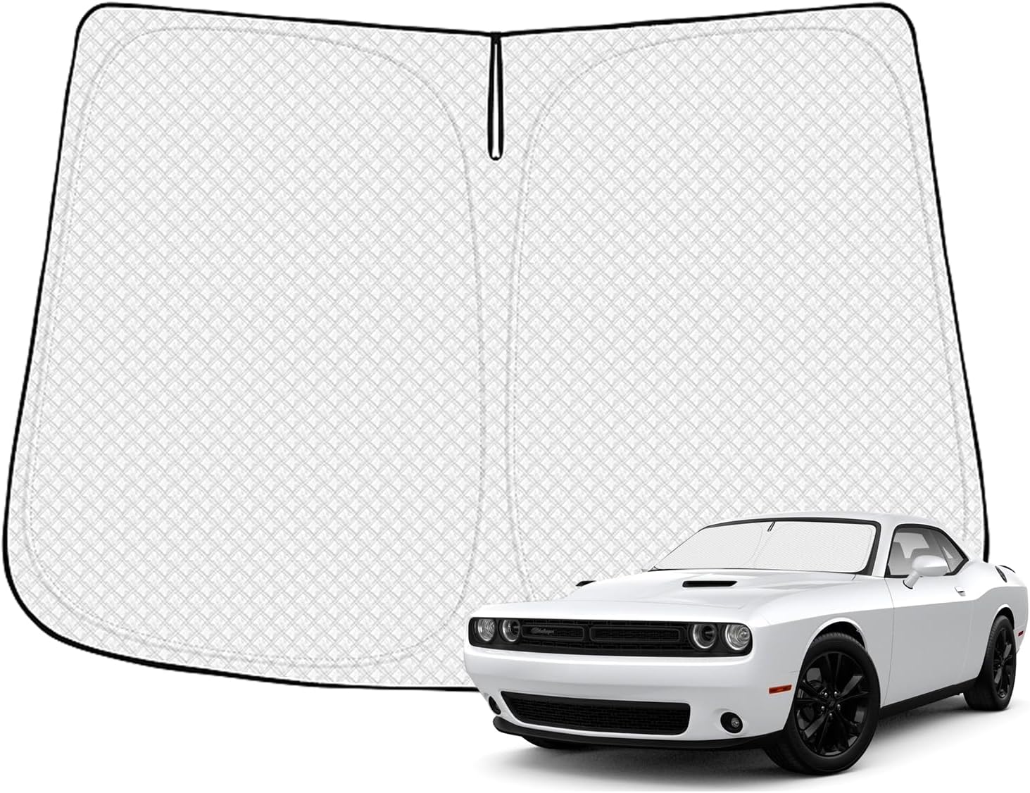- 【Perfect Fit】Canvcle windshield sun shield fits perfectly for Dodge Challenger Coupe,SRT Hellcat,Redeye,GT,RT,TA Coupe,Widebody,SXT,RT Scat Pack 2015 2016 2017 2018 2019 2020 2021 2022 2023 2024 2025 front windshield without any gaps, don't worry about the size. Works well in keeping your car cooler, will be a must-have accessory for your car!