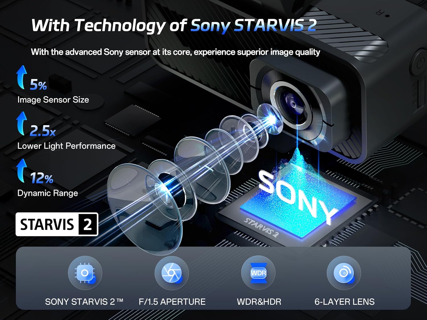 - 【STARVIS 2 Sensor & AI Night Vision】Image sensor with technology of STARVIS developed by Sony delivers 4x greater low-light sensitivity. Outperforms conventional night vision in all scenarios, from dimly lit urban streets to pitch-black rural roads and underground garages, capturing full color night vision in starlight. ( Hardwire kit is needed )