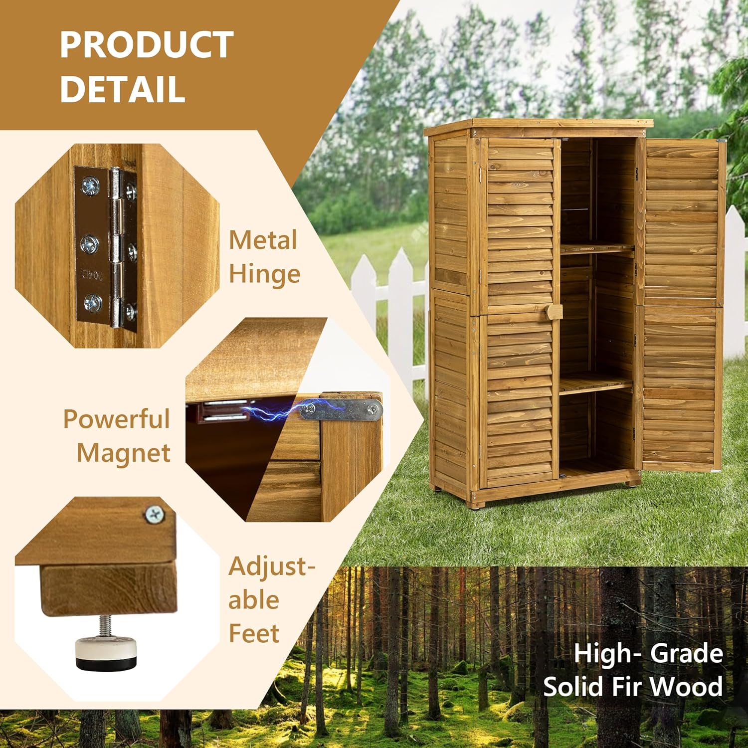 63 "H x 34.25 "L x 18.5 "W Vertical Garden Shed for Patio,Outdoor Wooden Storage Cabinet with Waterproof Roof, 2 Removable Shelves, and Adjustable Feet, Yard, and Garage,Natural Wood