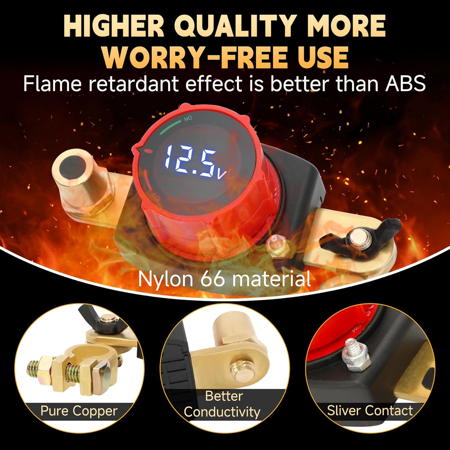 - Real-time Voltage Monitoring: Features a large matte-finish LED display that shows the current system voltage (5-60V DC) in real-time when the switch is ON, helping you accurately monitor battery status. The display turns OFF when the switch is OFF. The matte surface prevents scratches and enhances readability in bright light.