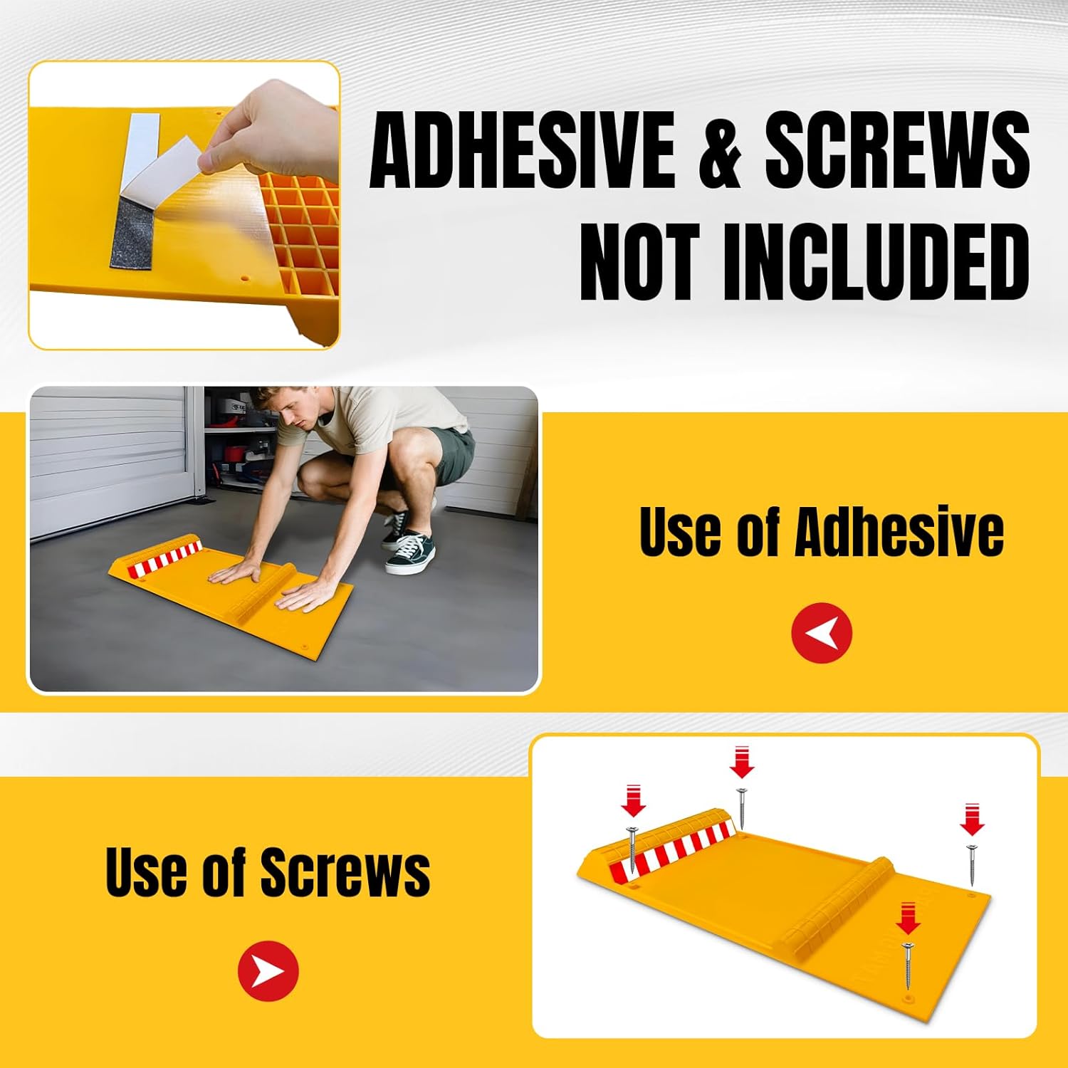 - Adhesive & Screws Not Included: Need to purchase adhesive or screws by yourself. Peel off the adhesive strip on the back and press the garage bumpers for parking car firmly onto the floor. For long-term use, you can use the screws to fix it to maintain good adhesion, so say goodbye to frequent shifting