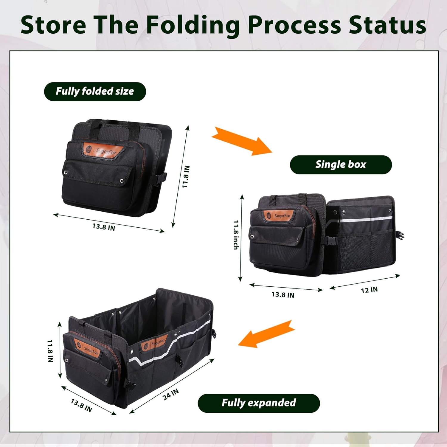 - Structural Design:The car storage organizer offers a 70L dual-compartment system (23.2"×13.8"×11.8") with adjustable dividers for versatile organization. A detachable mesh top expands vertically to store tall items like wine bottles, while its collapsible design folds to 3 inches when empty, optimizing space efficiency in your SUV trunk organizer.