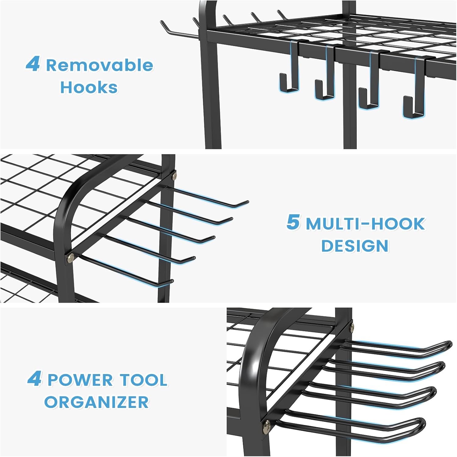 Hadulcet Garden Tool Organizer, Metal Garage Organization and Storage with Lockable Wheels, Garden Tool Rack with Storage Hooks, Heavy Duty Yard Tool Organizer for Garage, Shed, Lawn, Outdoor, Black