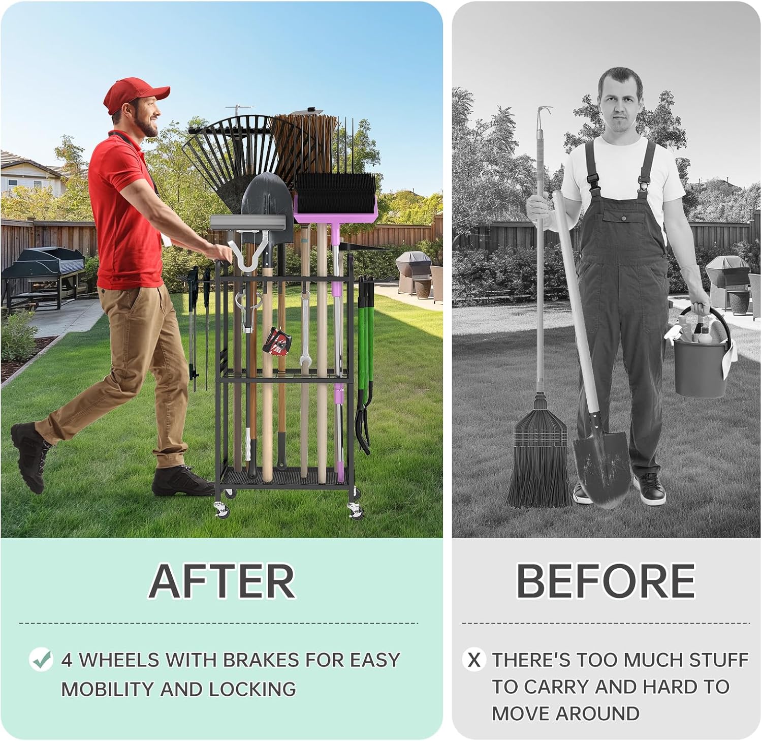 - Locking wheels—move freely: Unlike flimsy tool organizer that roll away on slopes, ours features smooth-gliding, lockable wheels! Simply engage the brake to stabilize the yard tool organizer for garage on grass, gravel, or uneven surfaces, preventing accidental slips. No other garden tool holder offers this much adaptable space-saving power