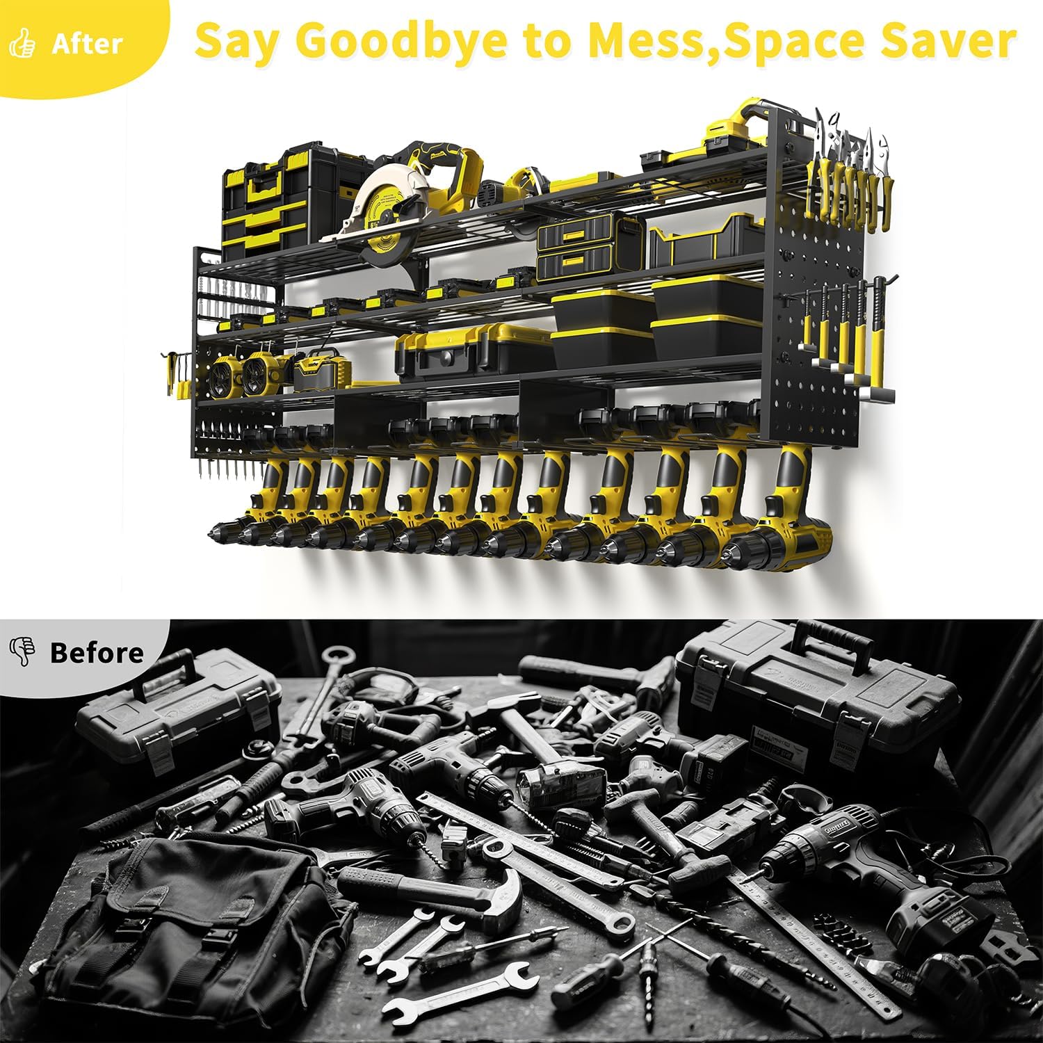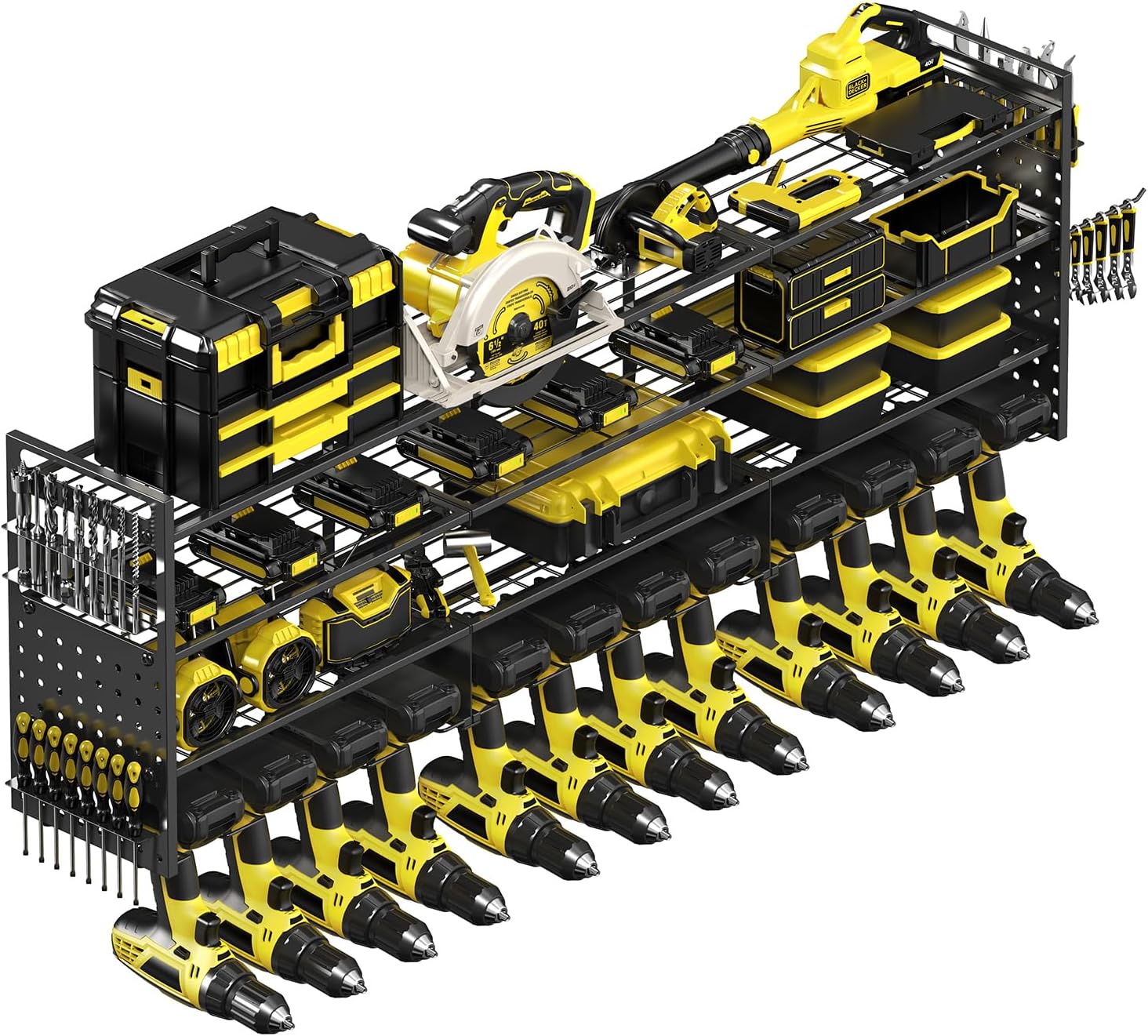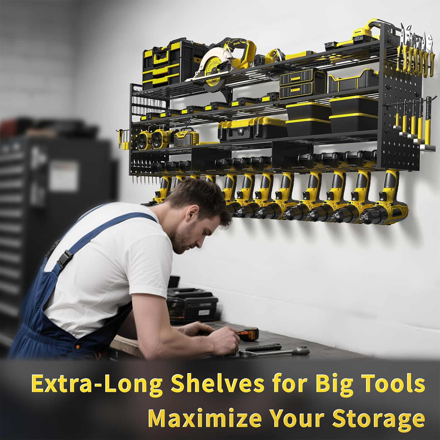 - 💪【52.4" Large 4-Tier Power Tool Organizer with 12 Drills Holder】 This power tool organizer wall mount features a 4-tier structure with a total length of 52.4 inches. Store up to 12 drills on the bottom tier, with spacious compartments above for batteries, toolboxes, hammers, angle grinders, heat guns, and more. Ideal for keeping every tool within reach and your garage clutter-free.