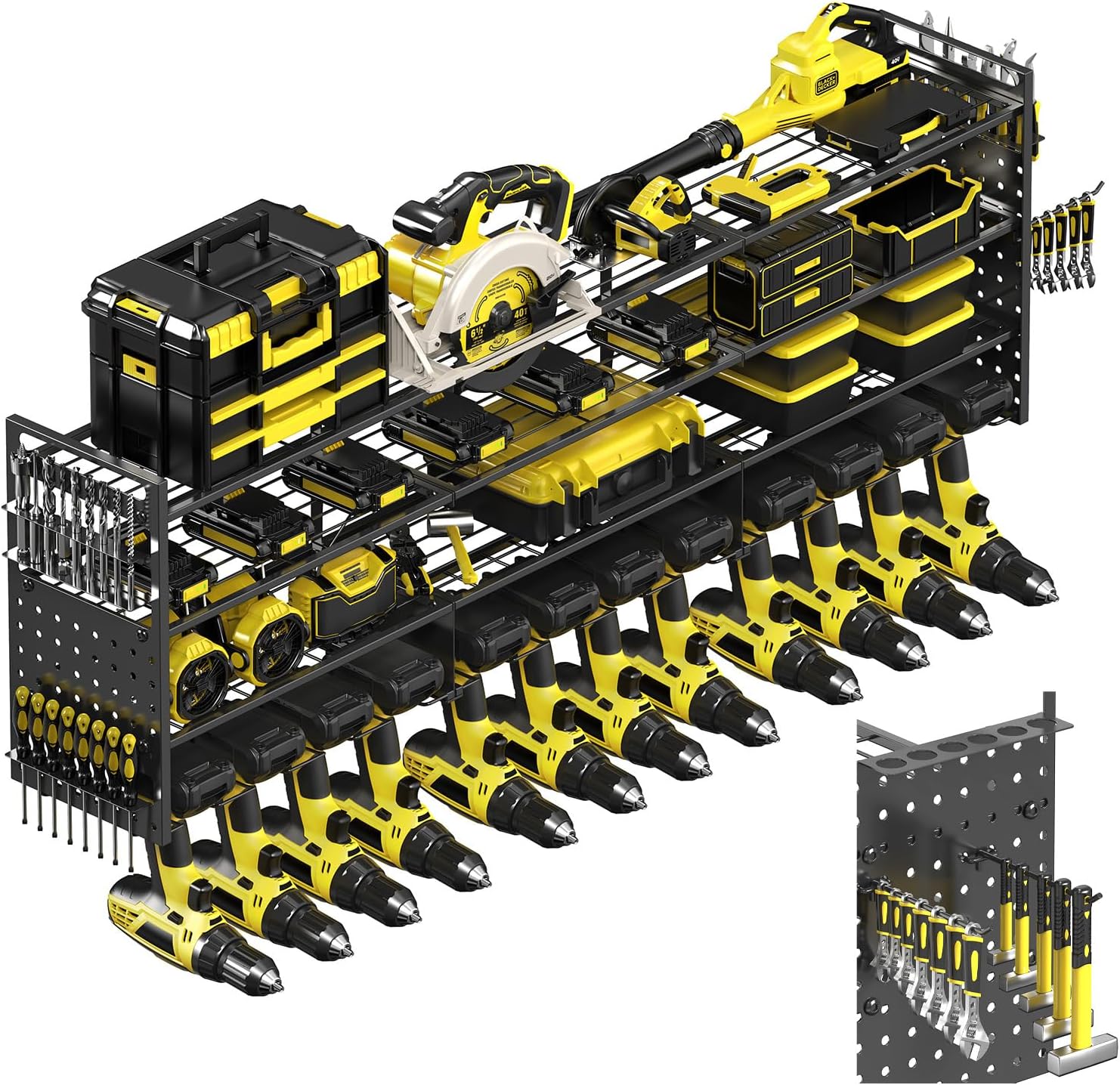 - Special Feature : 4-Tier, 12 Drills Holder, Pegboard Side Panels,4 Hooks, Heavy-Duty Build, Holds Up to 660 lbs, Multi-Functional DIY Pegboard Panels 4-Tier, 12 Drills Holder, Pegboard Side Panels,4 Hooks, Heavy-Duty Build, Holds Up to 660 lbs, Multi-Functional DIY Pegboard Panels