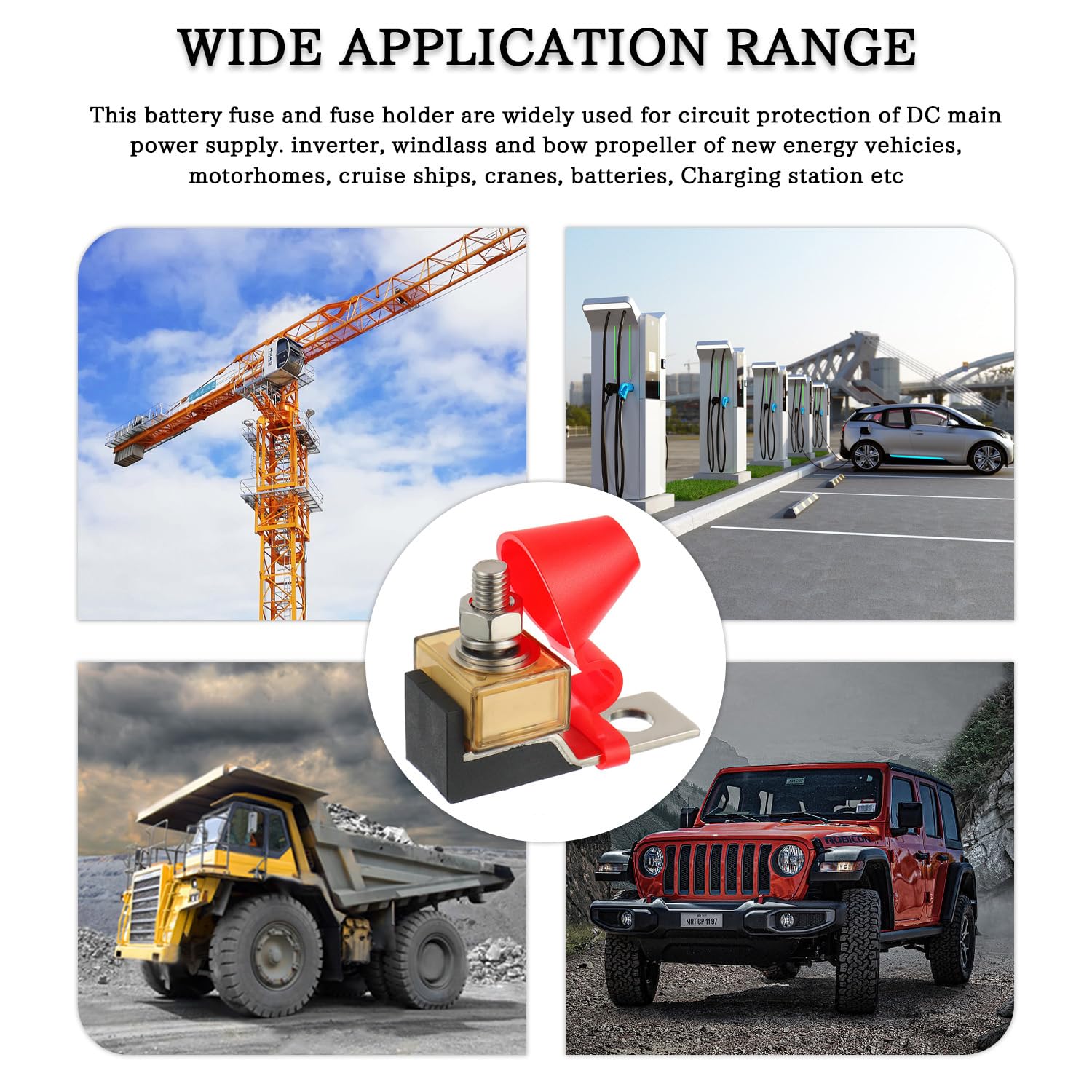 - 【Clever design】:Terminal Fuse Block is designed by compact which provides high current protection in tight space constraints and is suitable for DC mains, inverter leads, New energy vehicles, motorhomes, cranes, cruise ships and bow thruster circuits.