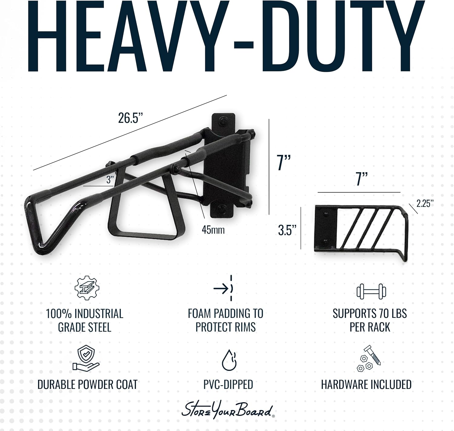 - 4-Pack Bike Rack Wall Mount: Organize road and gravel bikes flat against the wall with this 4 pack vertical bike rack. It holds all bikes with tires between 18 mm and 45 mm wide. From your lightest carbon frame to your heaviest e-bike, keep your bike adventure-ready.