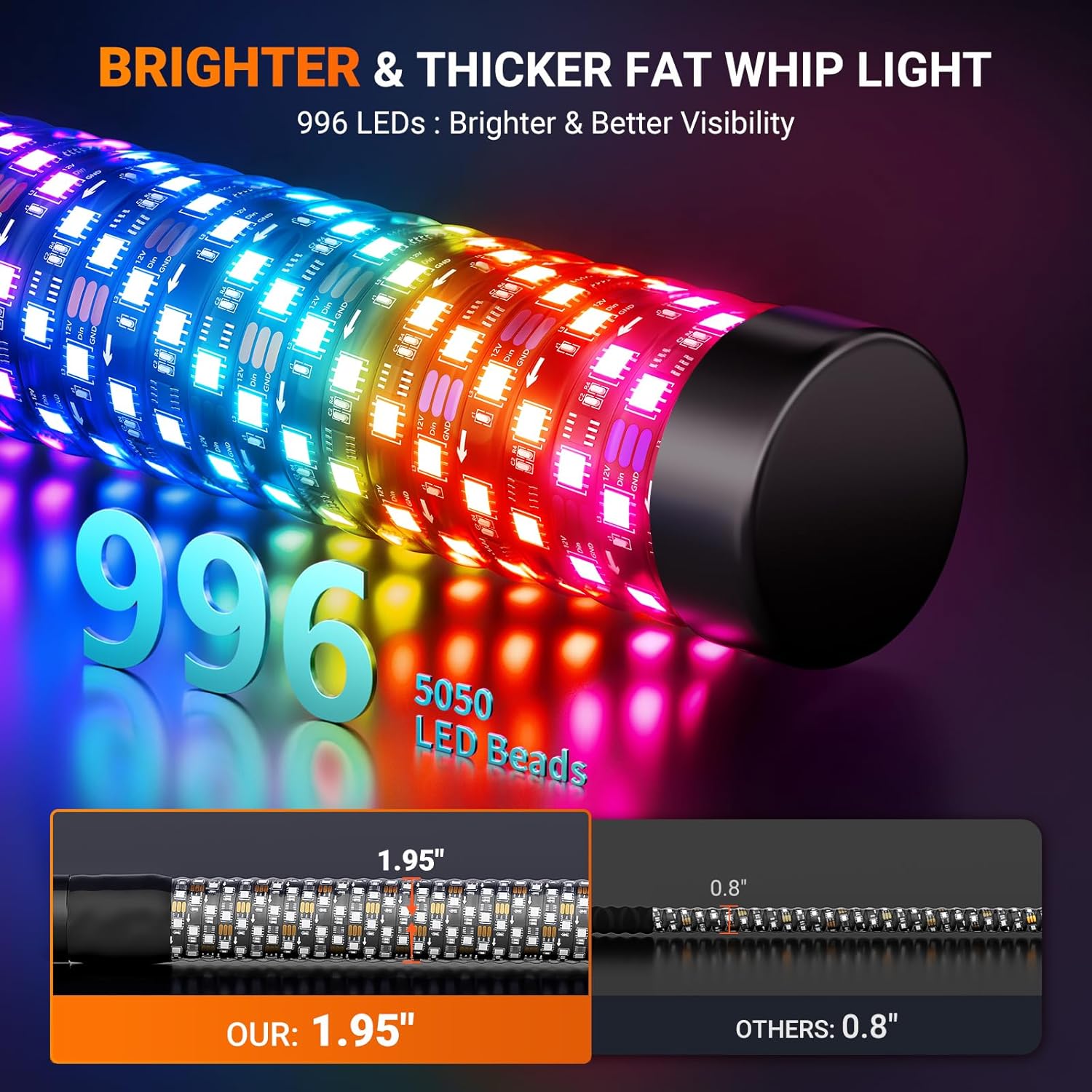 - 【UPGRADED 1.95 IN DIA and Brighter】Ehaho 4FT Fat Whip Lights pack 600 RGB LEDs using the latest 5050 RGB LED chips. These LED Fat Whip Lights are three times brighter and more visible, even in daylight. Featuring a smaller gap and the tightest coiled spiral design, these Fat LED Whips glow in a 360° direction, delivering brighter and more uniform colors