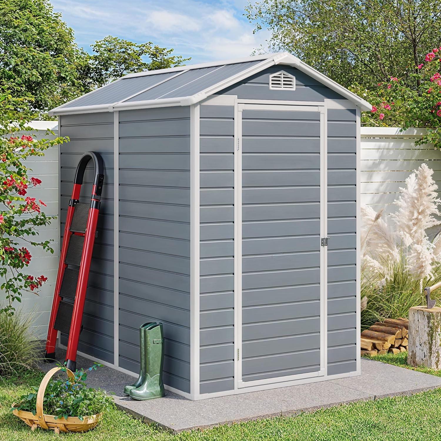 - Spacious Outdoor Shed: This 6 x 4 ft large capacity outdoor resin shed has overall dimensions: 76.4" D x 52.8" W x 78" H. It's a backyard shed with spacious storage space, practical and ornamental, and can accommodate a wide range of patio supplies such as lawn mowers, bikes, and storage racks, etc, and it can also be used as a pet house or a greenhouse