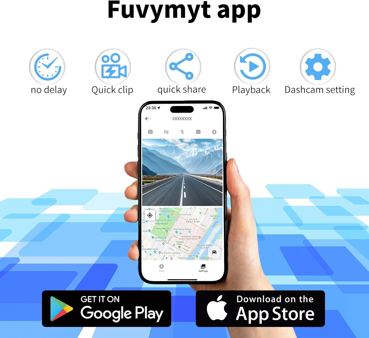 - [Easy Installation & Free app] The FUVYMYT dash cam has a simple installation that doesn't need to be rewired. With the fuvymyt app, which is designed for the FUVYMYT dash cam, you can get a faster connection speed and lower latency for living. Sharing and editing features make sharing beauty easy along the way. Tip: Turn off cellular data or Bluetooth if the preview is not working.Can't link carplay at the same time(WIFI password:12345678)