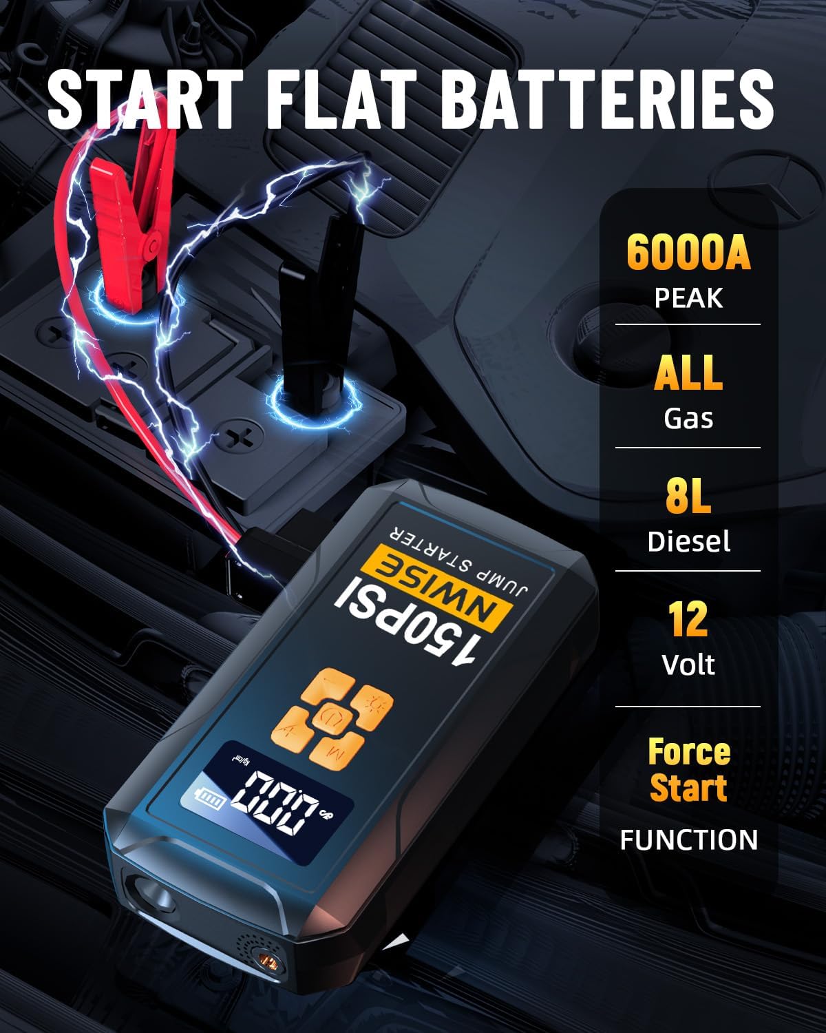 - What's Included:NWISE jump starter with air compressor*1, Smart jumper cables*1, pump tube*1, air nozzle*3, USB to type-C charging cable*1,Gift Box & Storage Bag*1,User Manual*1. If you have any problems during use, please contact us, we will solve it for you within 24 hours.
