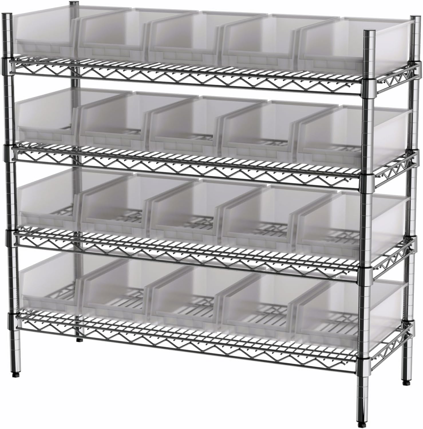 - DIMENSIONS: 36x14x33" - Each shelf level accommodates 5 storage bins, with 4 tiers creating an efficient storage solution for industrial or residential use (20 total bins)