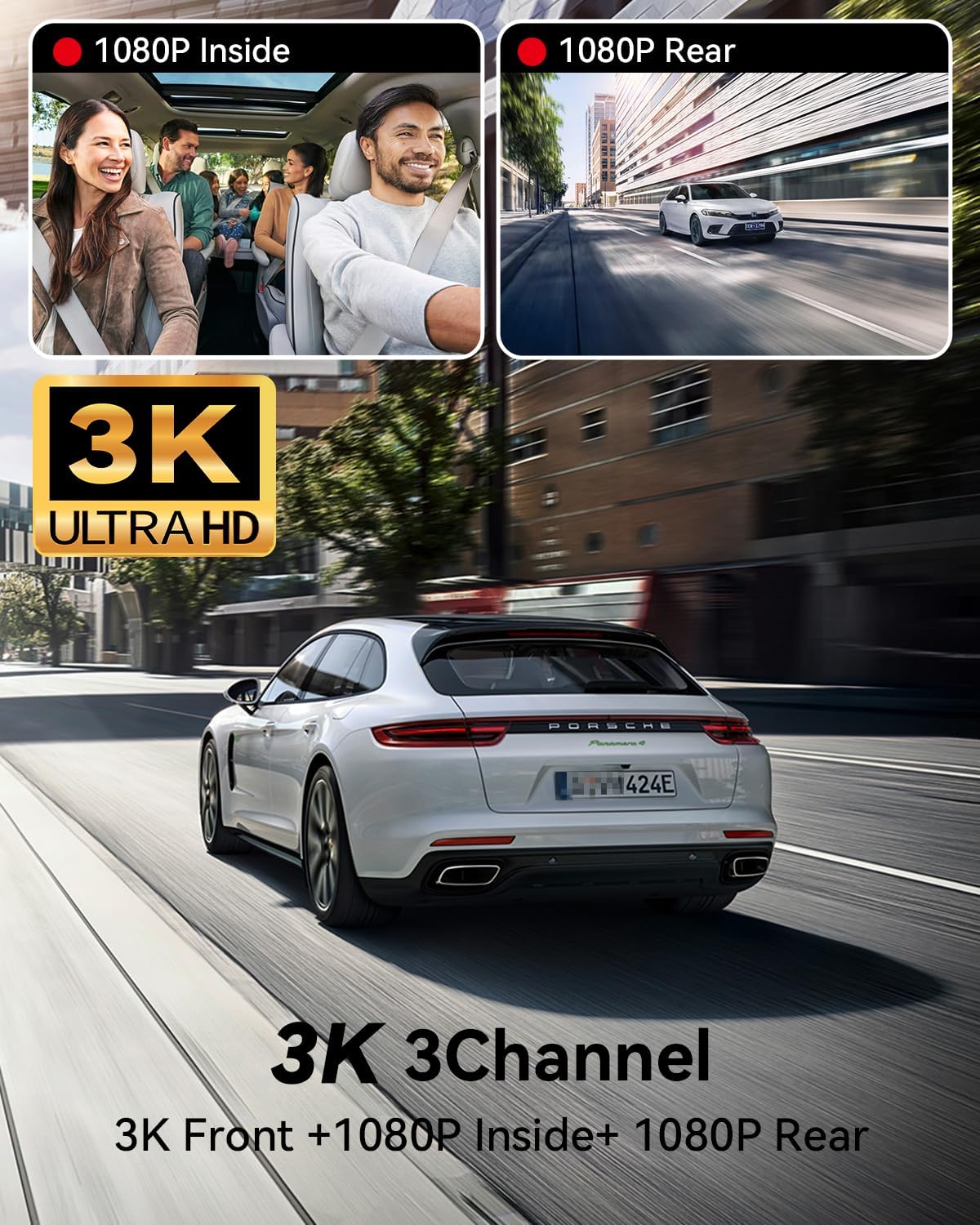 - 【3-Channel Dash Cam with 3K+1080P+1080P】This 3 channel dash cam features an industry-leading SONY IMX sensor and processor, delivering smooth, high-definition video. With simultaneous 3-channel recording, it offers 3K (2880x1620) front, 1080P (1920x1080) inside, and 1080P (1920x1080) rear resolution for comprehensive protection. The 170° wide-angle front, 150° inside, and 170° rear cameras eliminate blind spots, ensuring full coverage. Perfect dash cam front and rear inside 24/7 recording.