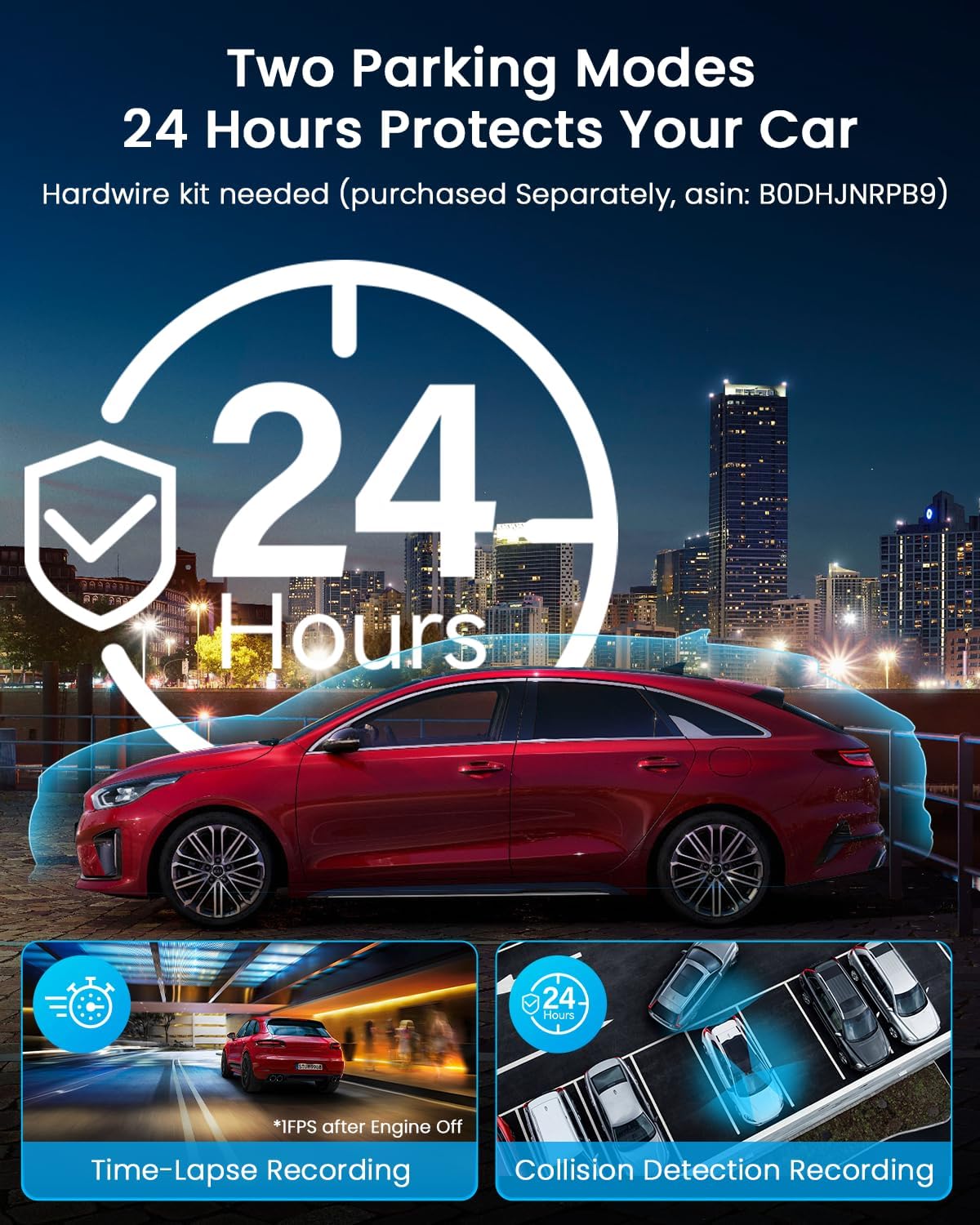 - 【24-Hour Parking Mode】The dash cam is equipped with a low-bitrate parking mode that enables continuous recording while the vehicle is parked, optimizing storage by reducing video quality. Additionally, the collision detection parking mode automatically triggers recording when an impact is detected. For continuous operation, the 3-channel dash cam must be connected to a hardwiring kit (sold separately, ASIN B0DHJNRPB9).