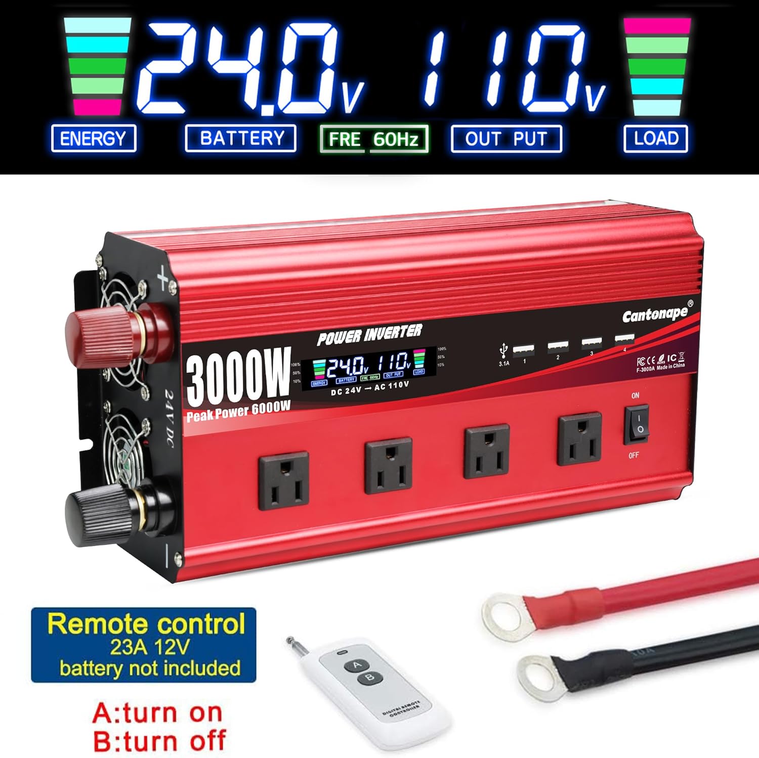 3000W Power Inverter 24V to 110V/120V DC to AC with LCD Display, Remote Controller 4 x AC Outlets and 4 x 3.1A USB Car Adapter for Car Truck Boat RV Solar System