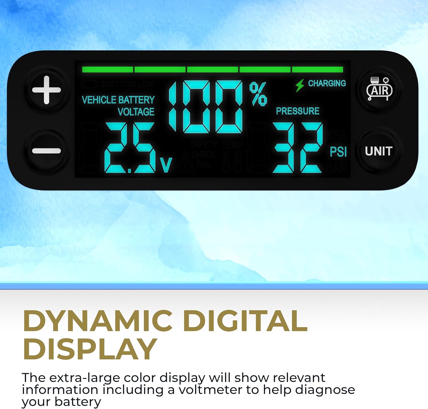 - DESIGN: 4-in-1 Design (Jump + Inflate + Charge + Illuminate), 1500 Peak Amps, Up to 80 Jumps on a Full Charge, 3-Step Jump Start, Spark-Proof Technology, Patented Safety Protection, Integrated Voltmeter, Dynamic Digital Display, Integrated Air Compressor, Precision Air Pressure Control, Bi-Directional USB-C, Pass-through Charging, 3-Way Multi-device Charging, 3-Mode Floodlight (White, Red & Red SOS), Durable Construction. Air Travel Ready