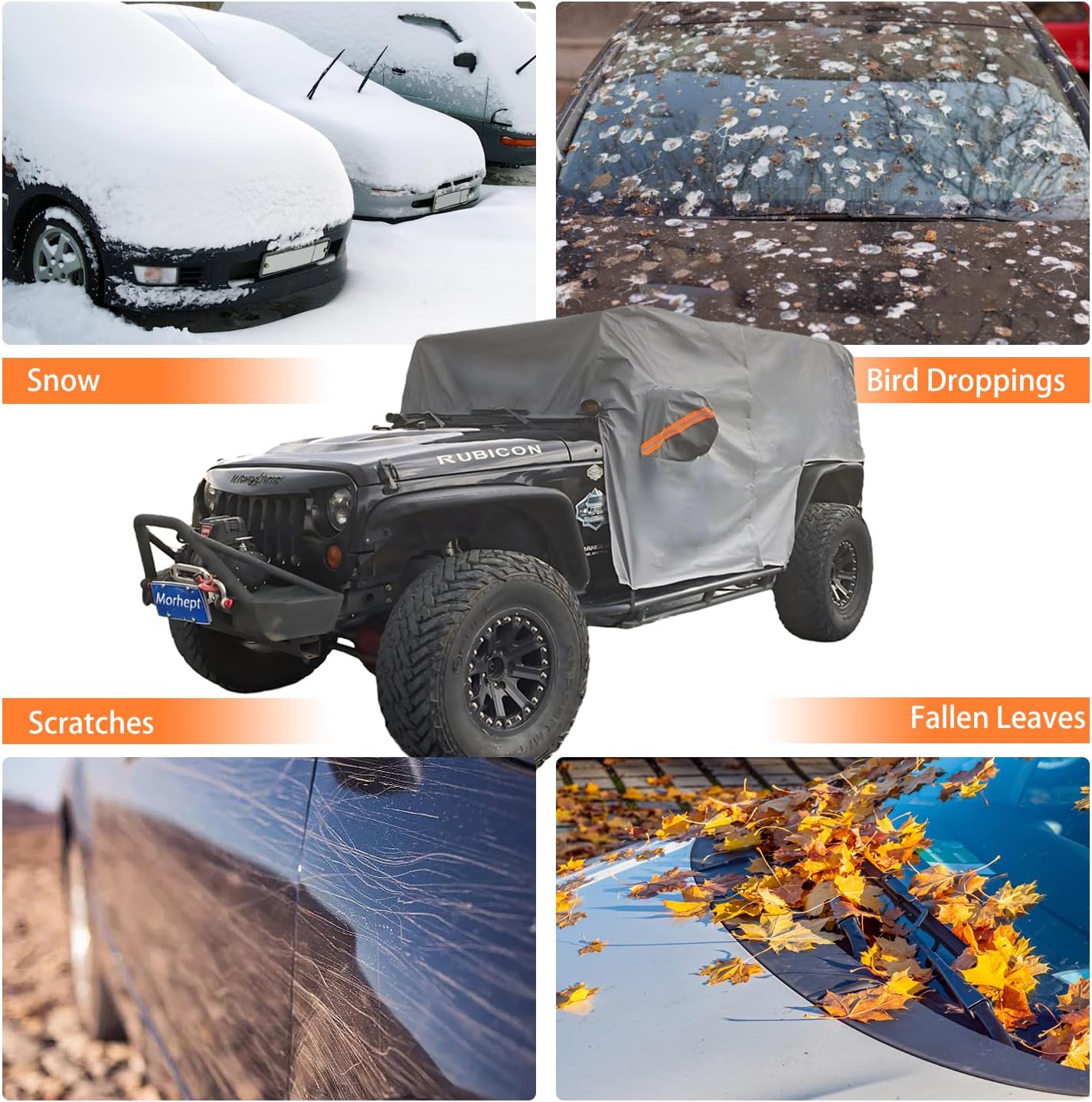 - Heavy-Duty Construction: Morhept cab cover is custom fit for Jeep Wrangler 4 Door 2007-2025 JK JL. Engineered with useful materials to withstand the rigors of outdoor use, and the soft inner lining of the cover will prevent damage to the car paint, providing long-lasting protection for your valuable investment.