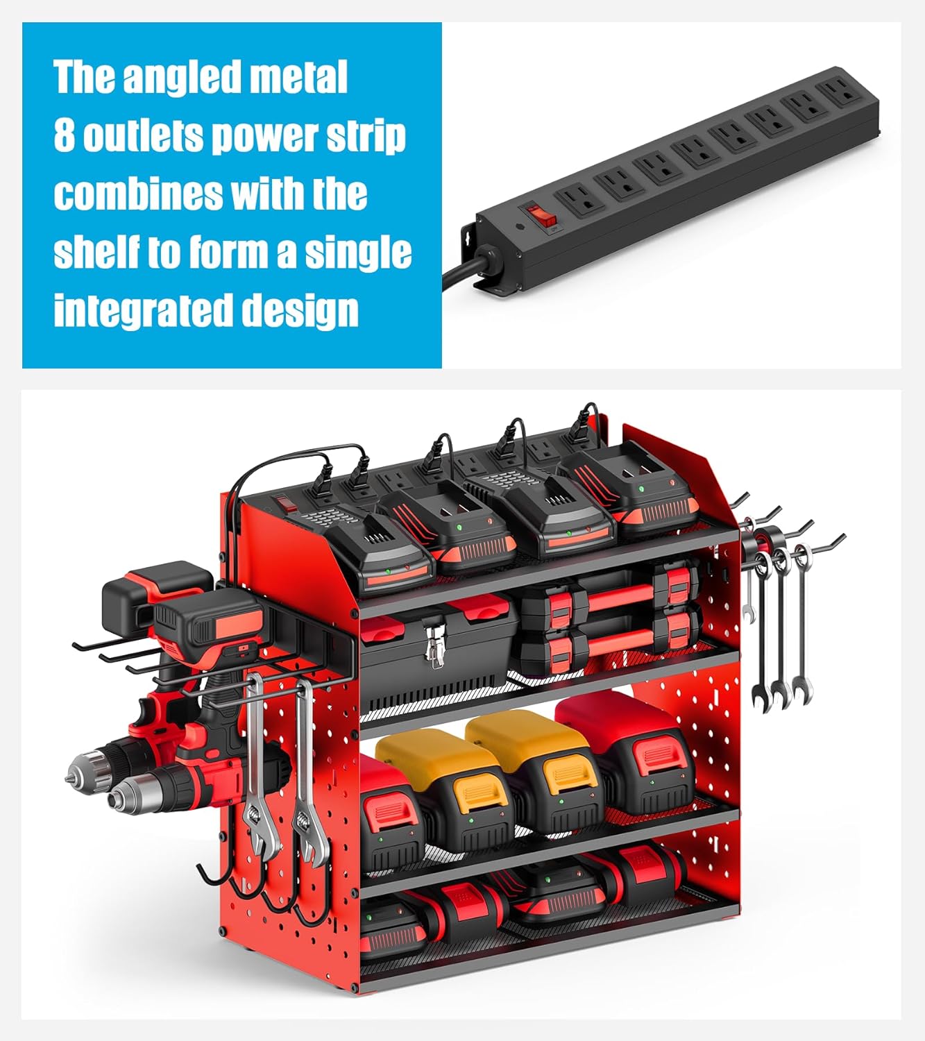 CCCEI Modular Desk Power Tools Organizer with Charging Station, 4 Layer Drills Battery Storage Wall Mount, Garage Shop Organization, Anniversary, Birthday, Gifts for Men, Father, Red, 10FT Cord.