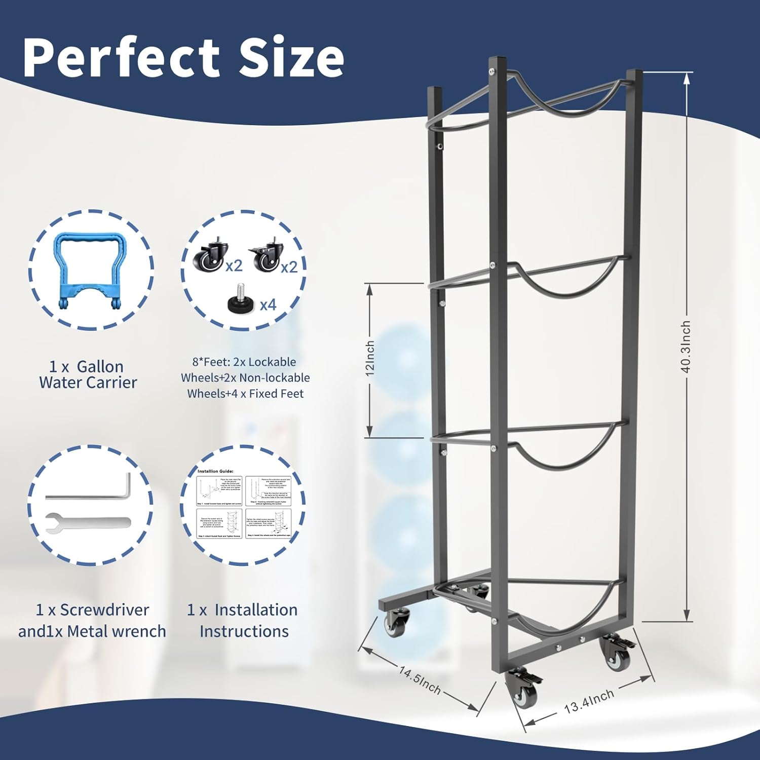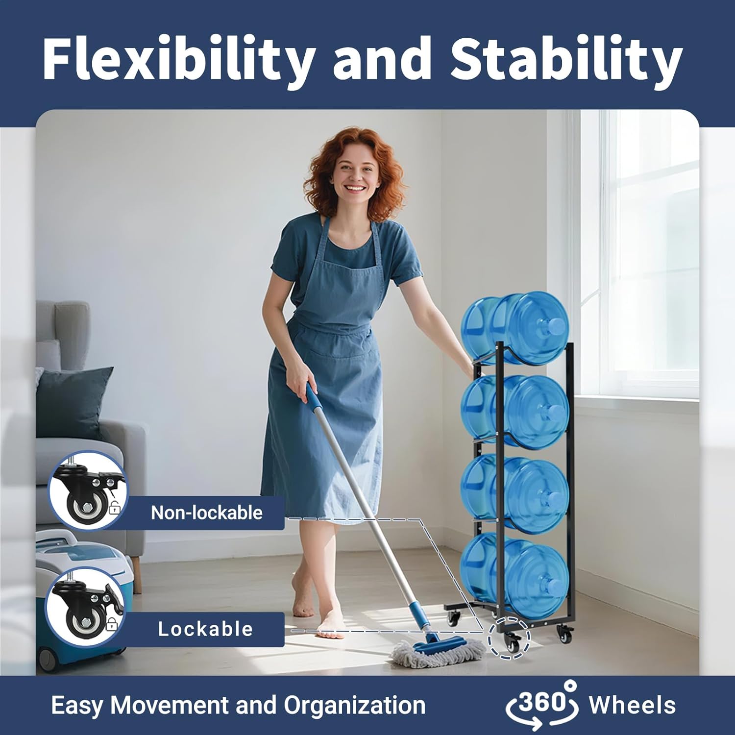 5 Gallon Water Bottle Holder: 4 Tier 5gal Water Jug Storage Rack with 4 Wheels for Home Kitchen Garage - Space Saving & Black