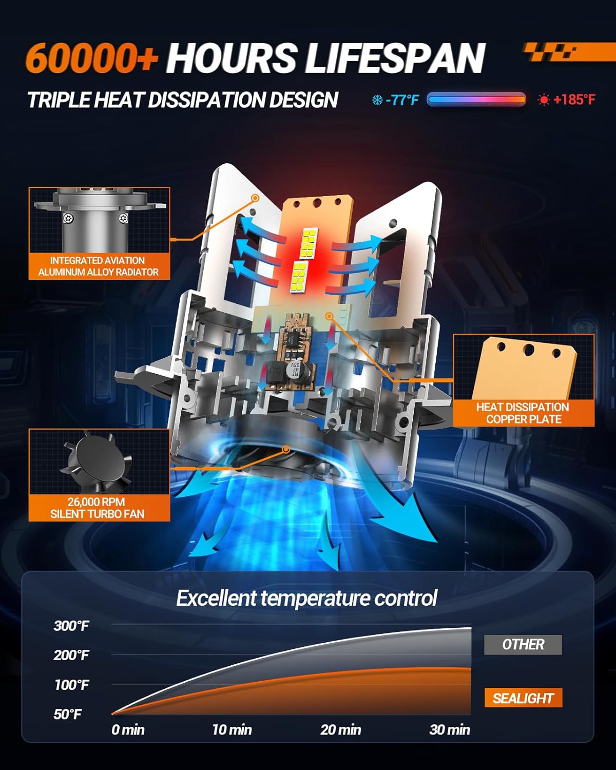 - 60000+ Hours Lifespan: Equipped with a 13000RPM high-speed cooling fan, Sealight H4 led bulbs or Fog Lights offer exceptional heat dissipation, providing over 50,000 hours of reliable illumination and smooth operation.In addition, IP67 waterproof technology can make it use in a variety of weather
