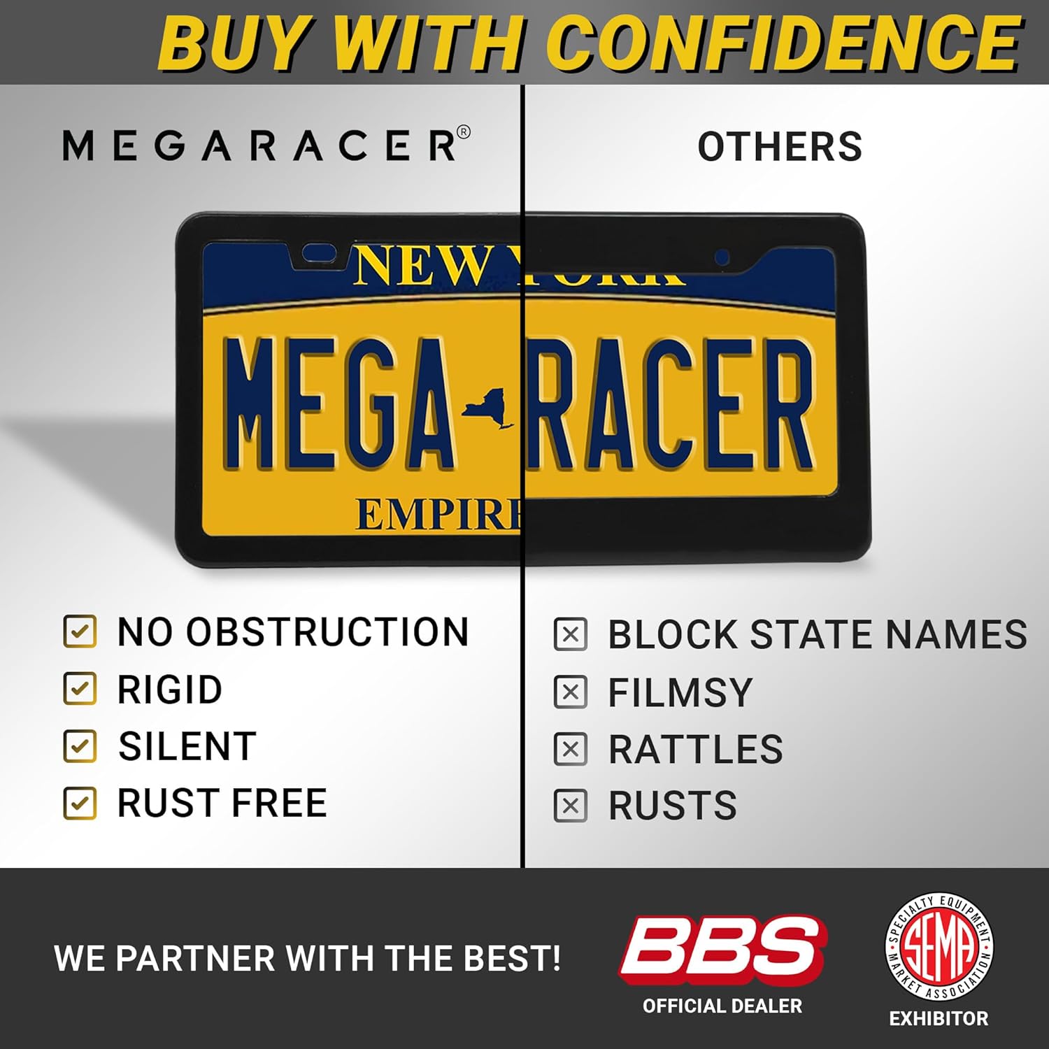 - VALUE PACK OF 4: Mega Racer's Black License Plate Frame Set contains a 4 piece slim license plate frame and is mighty strong. This cool sleek style ensures that the state name and registration tag are not blocked.