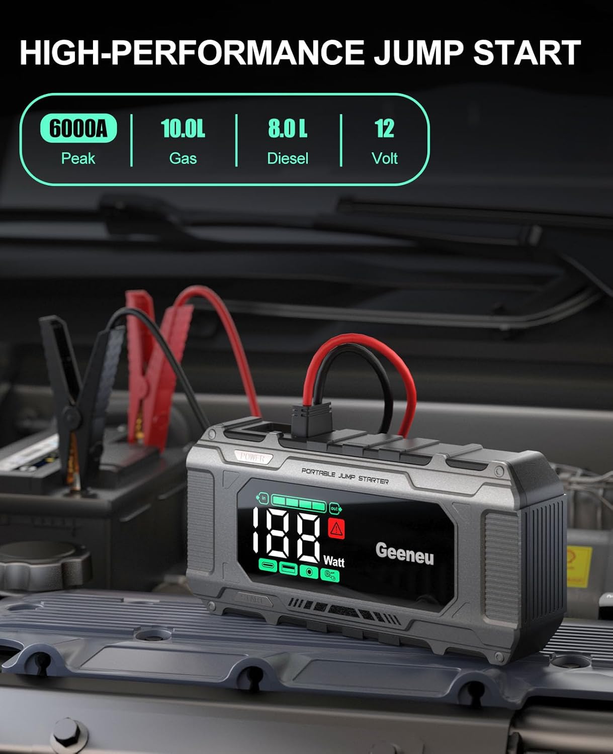 Battery Jumper Starter Portable 6000A Car Jump Starter, 12V Jump Box for Car Battery Charger Power Pack for 8.5L Gas/7L Diesel, QC 18W, Large Screen, Lights