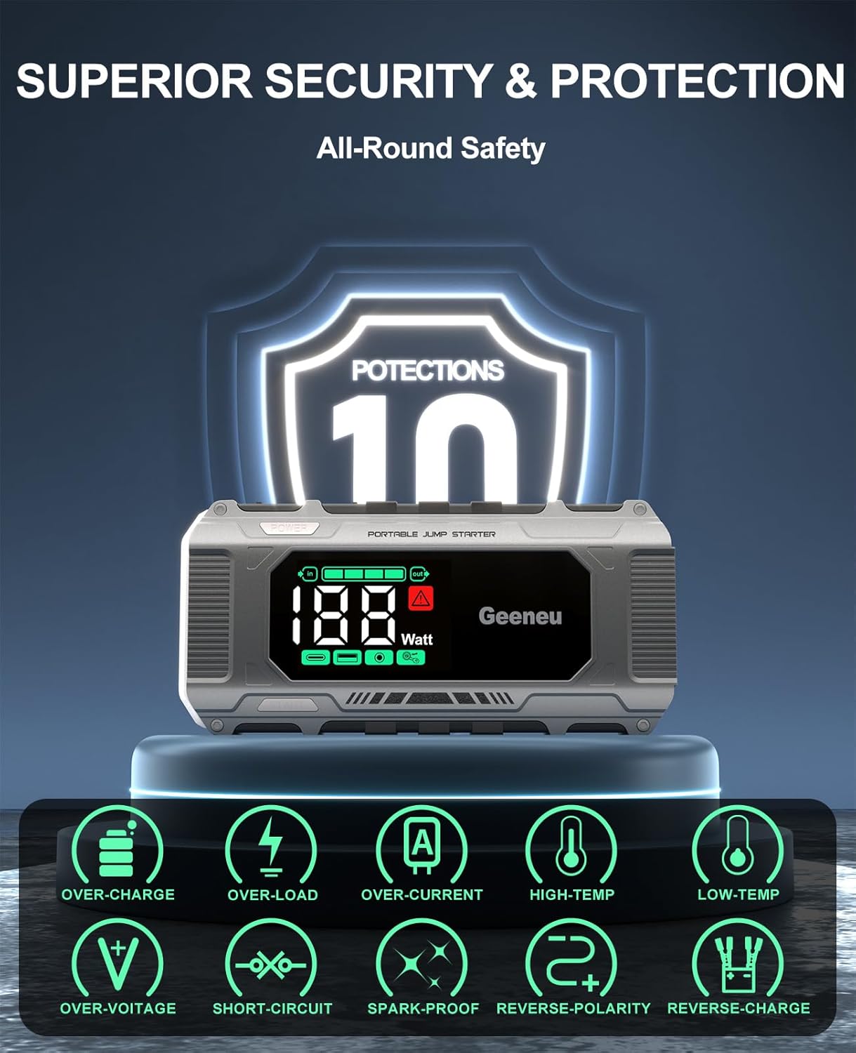 - ARCTIC-TO-DESERT TOUGH & CERTIFIED SAFE: Engineered to operate flawlessly from -4°F to 140°F. It’s UL/FCC/CE certified and built-in 10 safety features safety features such as reverse polarity, overcharge, and short-circuit protection to help prevent damage to your vehicle's electrical system and ensure safe operation