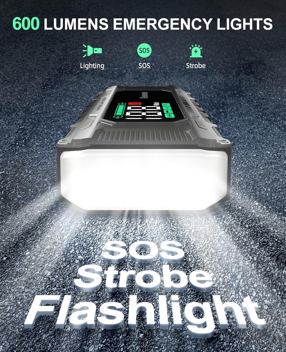 - 600 LUMEN 3-IN-1 EMERGENCY LIGHTS: Design with 3 modes that includes SOS, strobe, and high-beam modes. The illumination is 3 times brighter than normal to battle darkness easlily, this car jump starter can doubles as an outdoor survival lighting essential