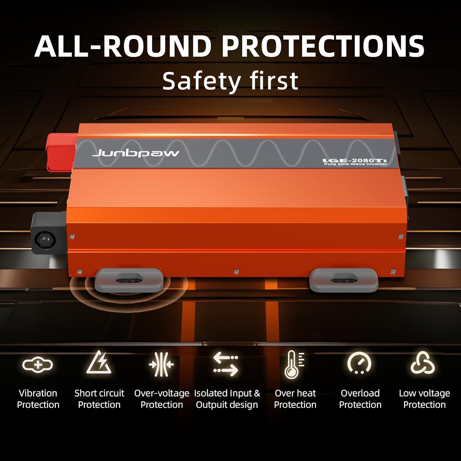 - 2080 Watt Pure Sine Wave Inverter: The Junbpaw inverter utilizes advanced pure sine wave technology to deliver stable AC power, equivalent to grid quality, safeguarding and prolonging the lifespan of your electronics and appliances.