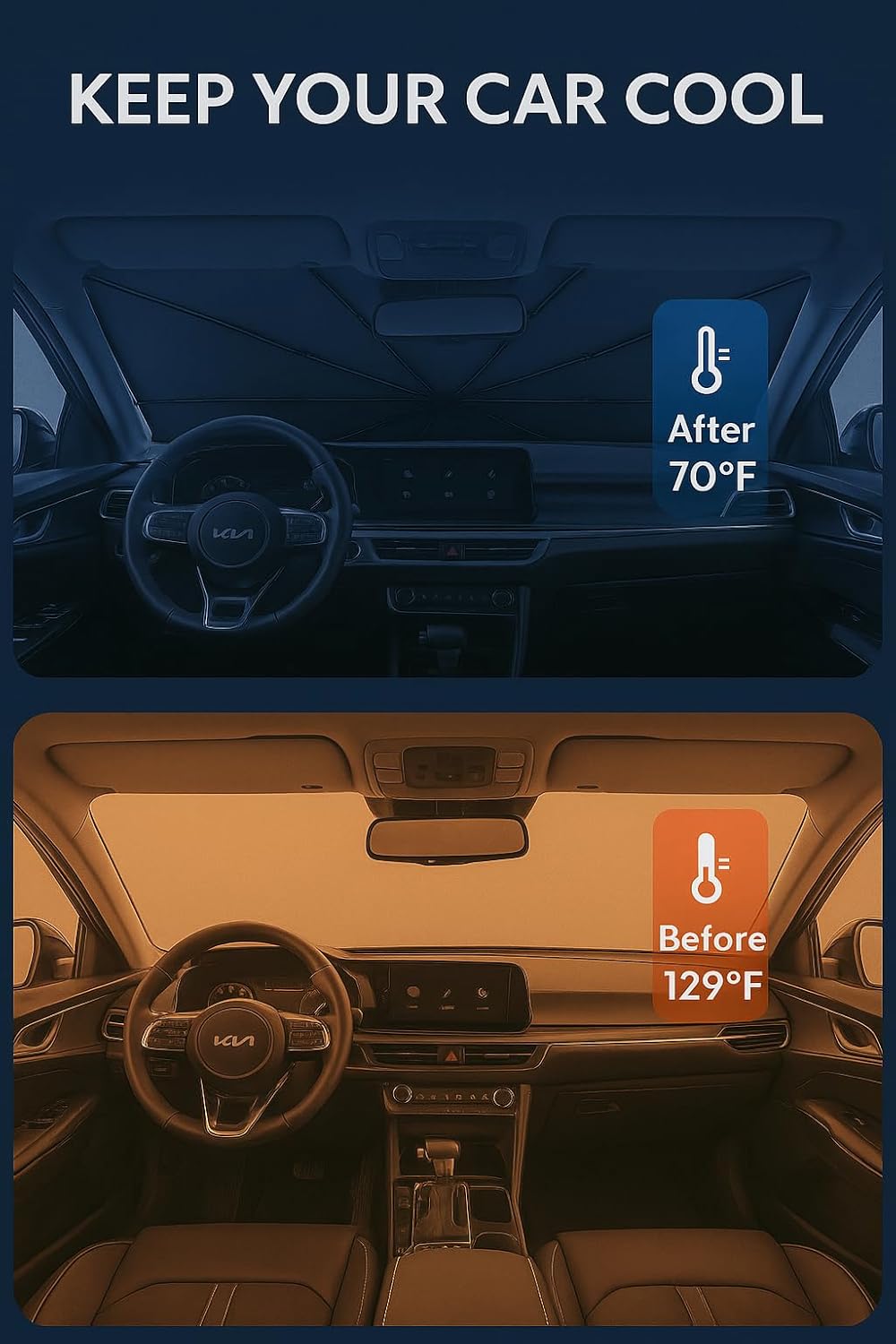 - Certified Sustainable. Customized Windshield Sunshade: Specially designed for the 2019-2025 Kia K5 with precise mirror cutouts, providing 100% shading, carbon fiber handle, ensuring lightweight and durability while also having a fashionable feel. Our K5 windshield sunshade can protect the interior of your car from various light damage and prevent dashboard and seat degradation.