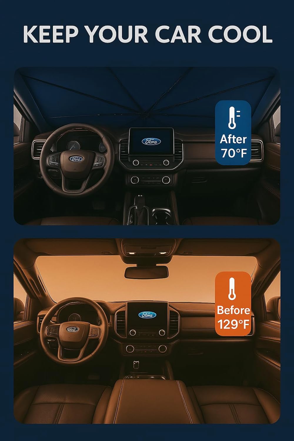 - Certified Sustainable. Customized Windshield Sunshade: Specially designed for the 2018-2025 Ford Expedition with precise mirror cutouts, providing 100% shading, carbon fiber handle, ensuring lightweight and durability while also having a fashionable feel. Our Expedition windshield sunshade can protect the interior of your car from various light damage and prevent dashboard and seat degradation.